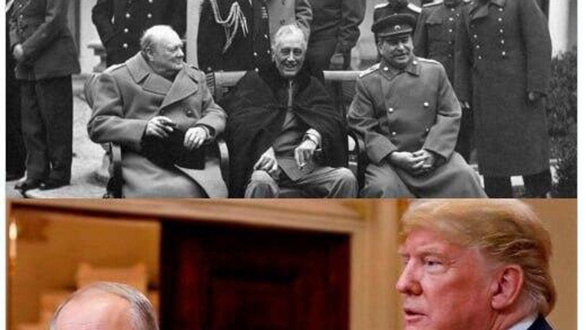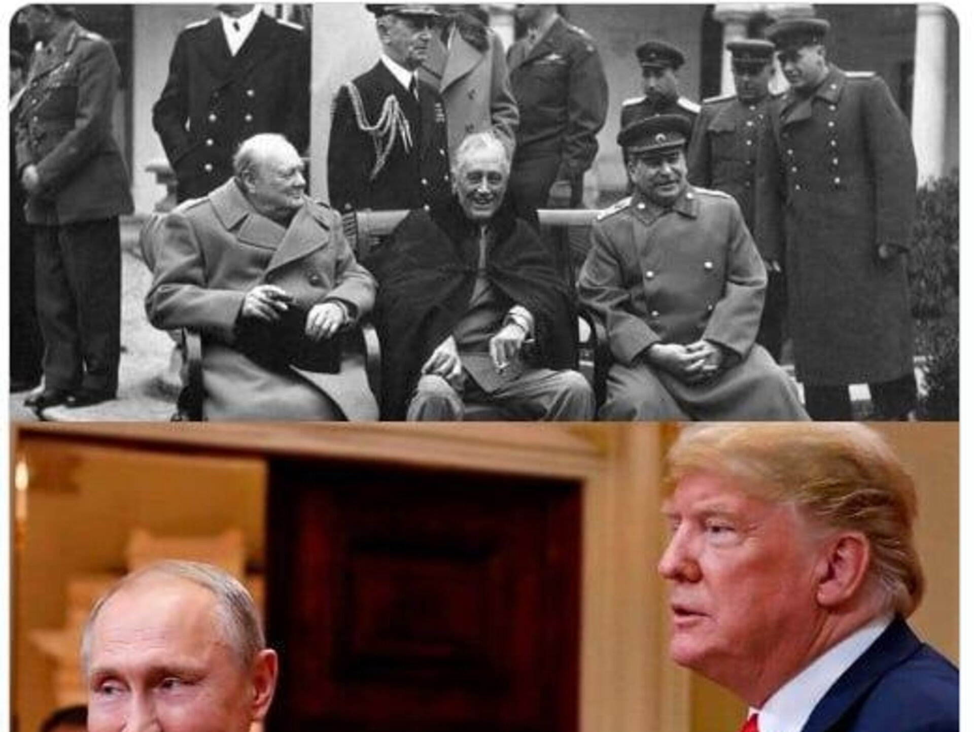 Para reforzar su argumento, Dmítriev compartió dos impactantes imágenes. La primera, en blanco y negro, muestra a Joseph Stalin, Franklin Roosevelt y Winston Churchill, artífices de la Victoria en la Segunda Guerra Mundial. La segunda, en color, muestra a Vladímir Putin y Donald Trump.