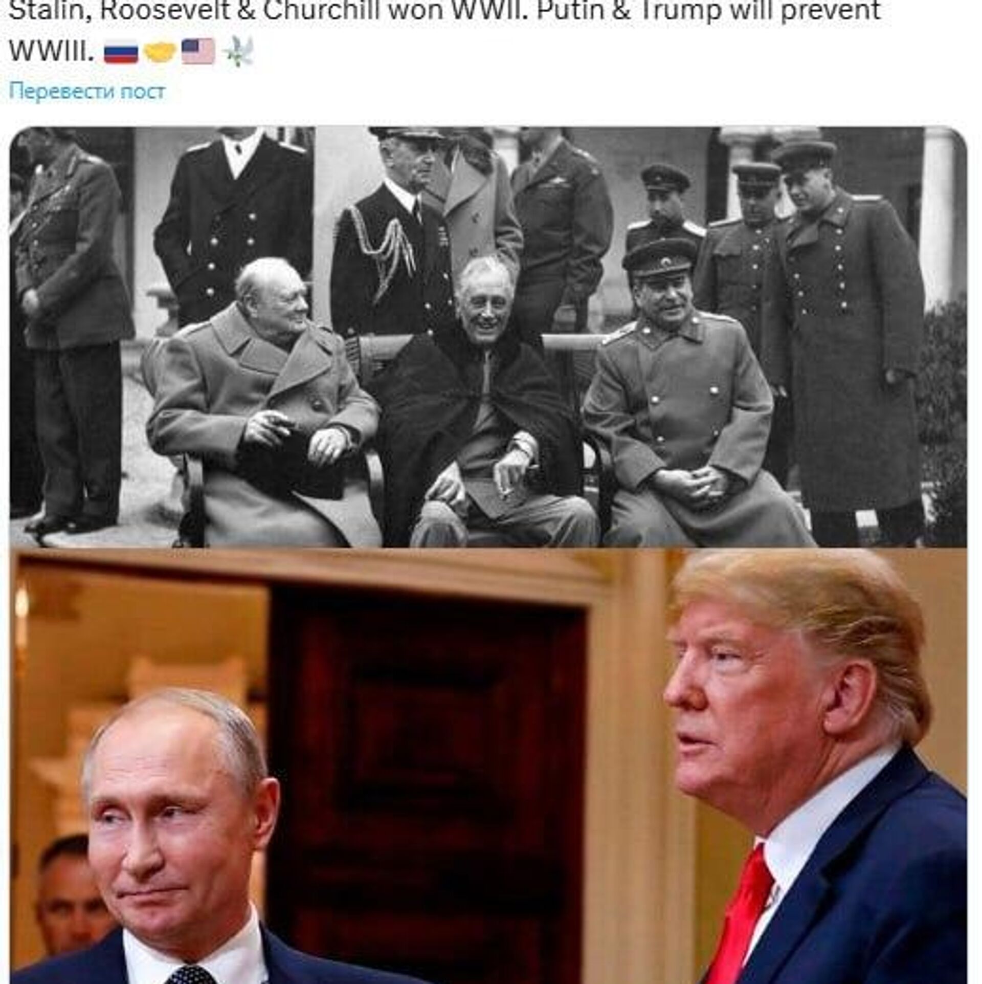 "Stalin, Roosevelt y Churchill ganaron la Segunda Guerra Mundial. Putin y Trump evitarán la Tercera Guerra Mundial", escribió en la red social X.