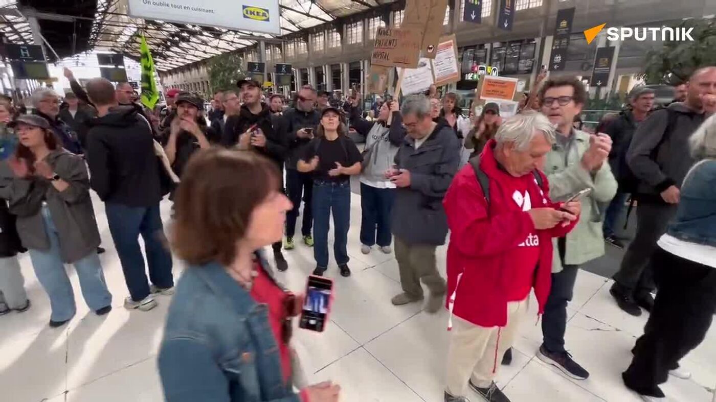 Decenas de manifestantes, portando banderas sindicales y bengalas encendidas, protestaron contra las medidas de austeridad propuestas por las autoridades francesas en la estación de Lyon, informó el corresponsal de Sputnik.