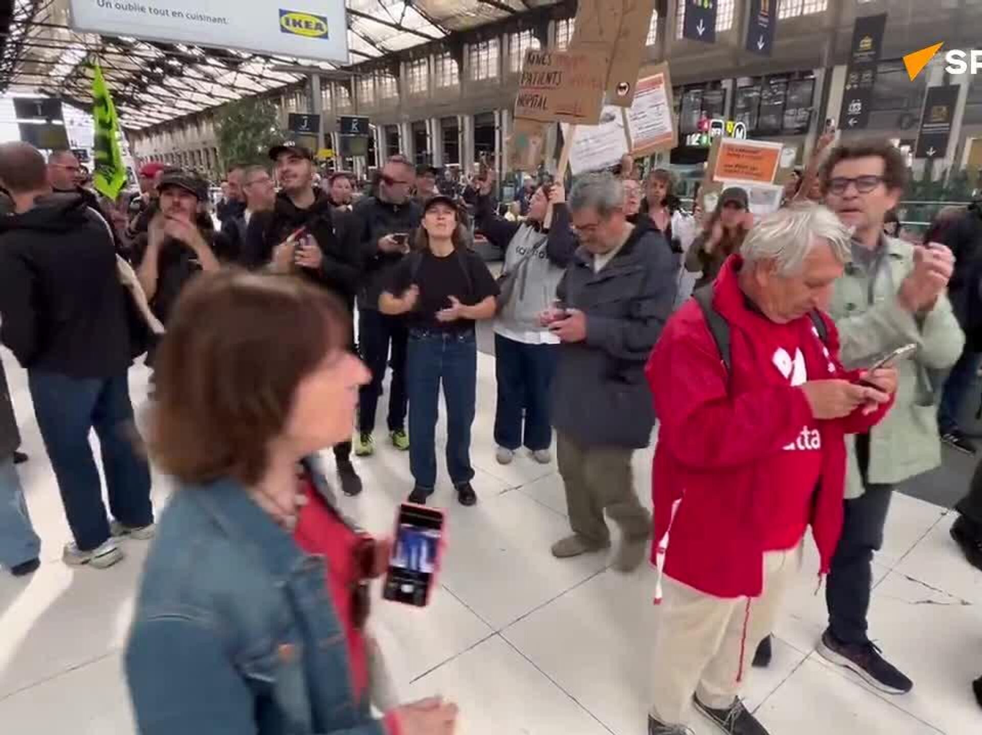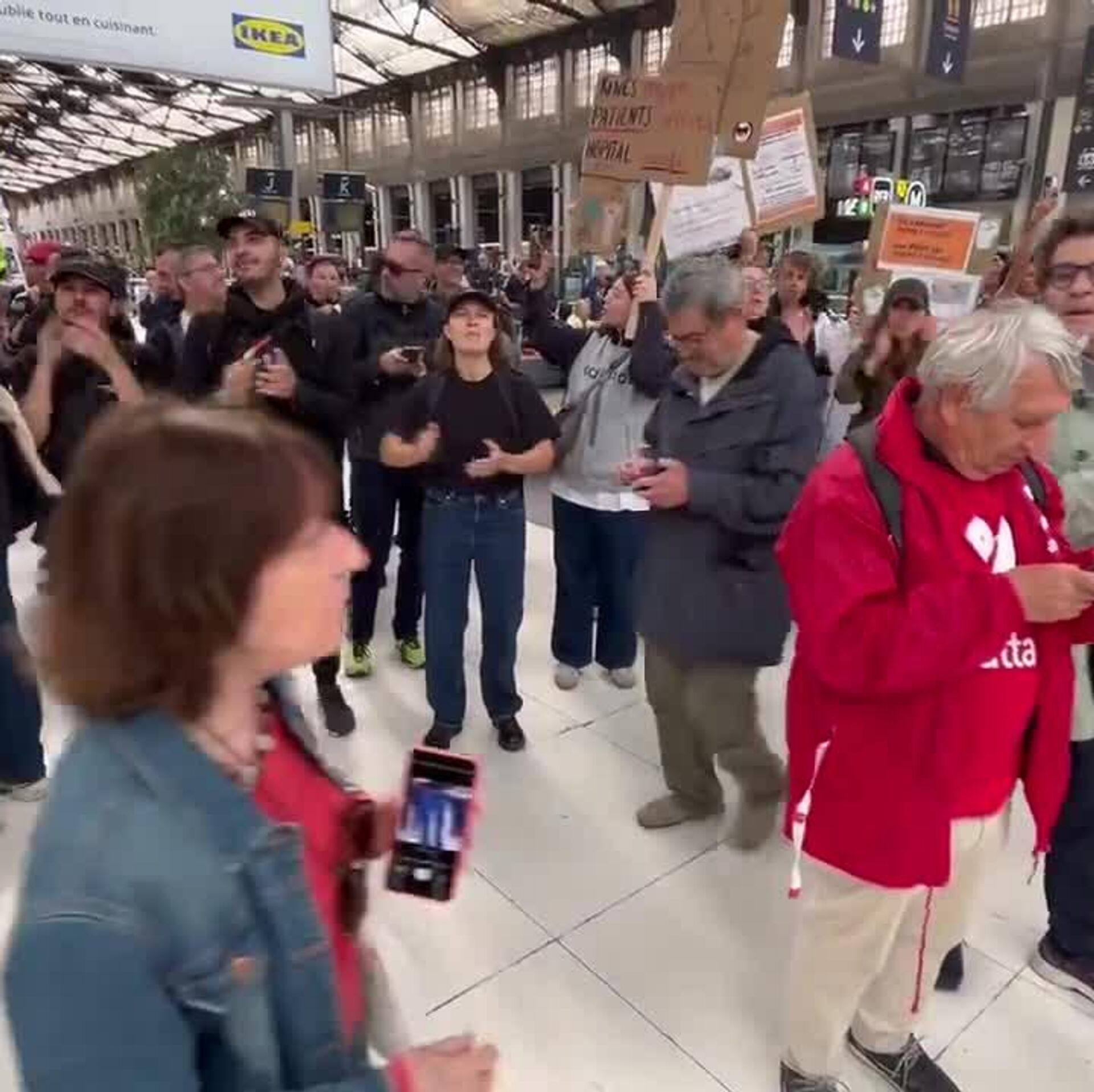 La columna recorrió uno de los andenes y, posteriormente, algunos participantes subieron al balcón en la estación, desde donde corearon consignas, entre ellas llamados a la dimisión del presidente francés, Emmanuel Macron.