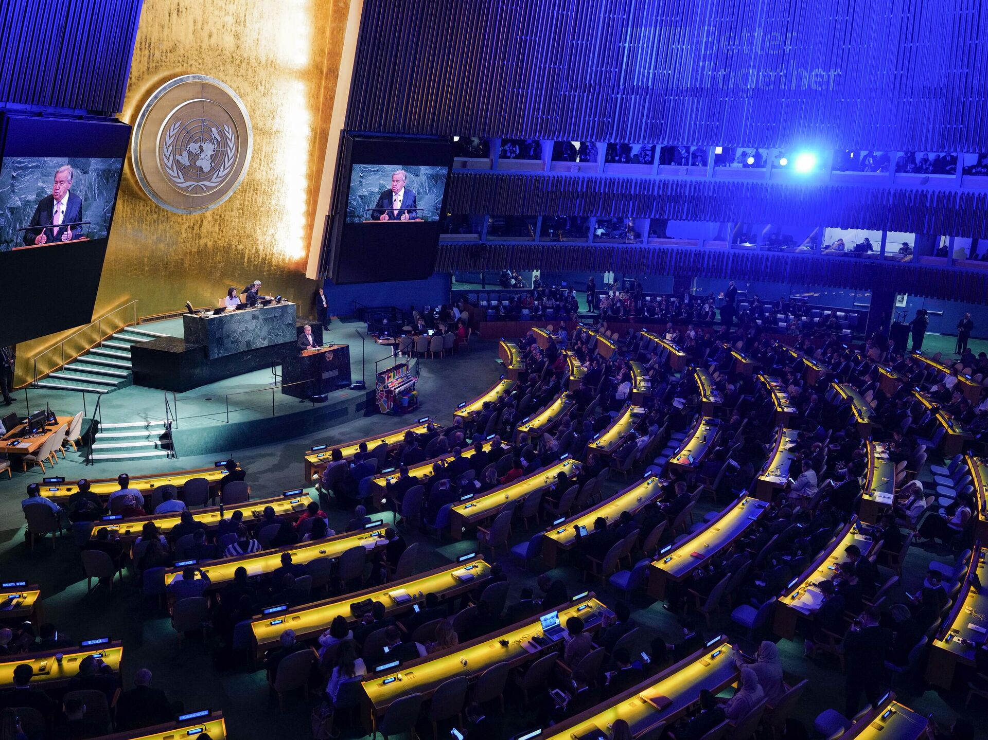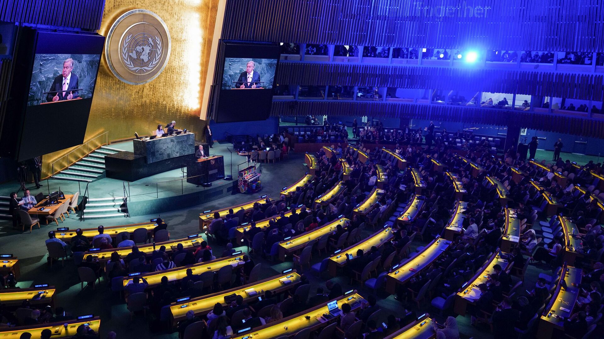 El Secretario General de la ONU, Antonio Guterres, habla durante la reunión de alto nivel en la sede de la ONU durante la 80.ª sesión de la Asamblea General de la ONU en la ciudad de Nueva York, EEUU, el 22 de septiembre de 2025 - Sputnik Mundo, 1920, 23.09.2025