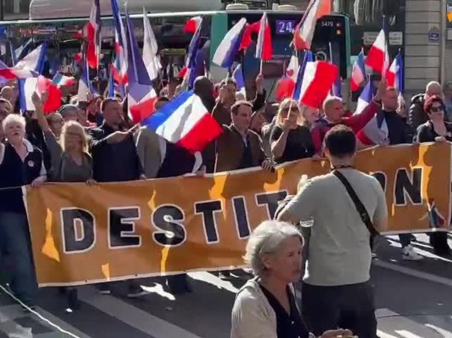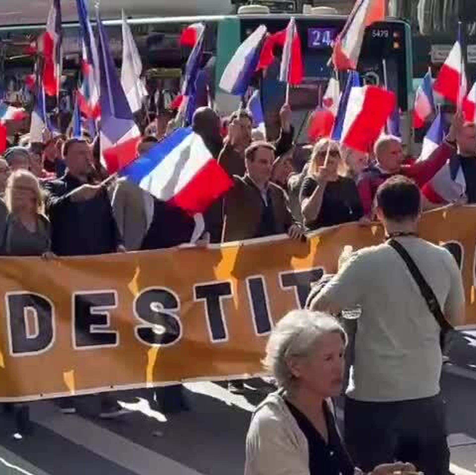 "En medio de un increíble bosque de banderas francesas, miles y miles de franceses gritan ¡Macron, fuera!, ¡Tiene que irse!", escribió su líder, Florian Philippot, en la red social X.