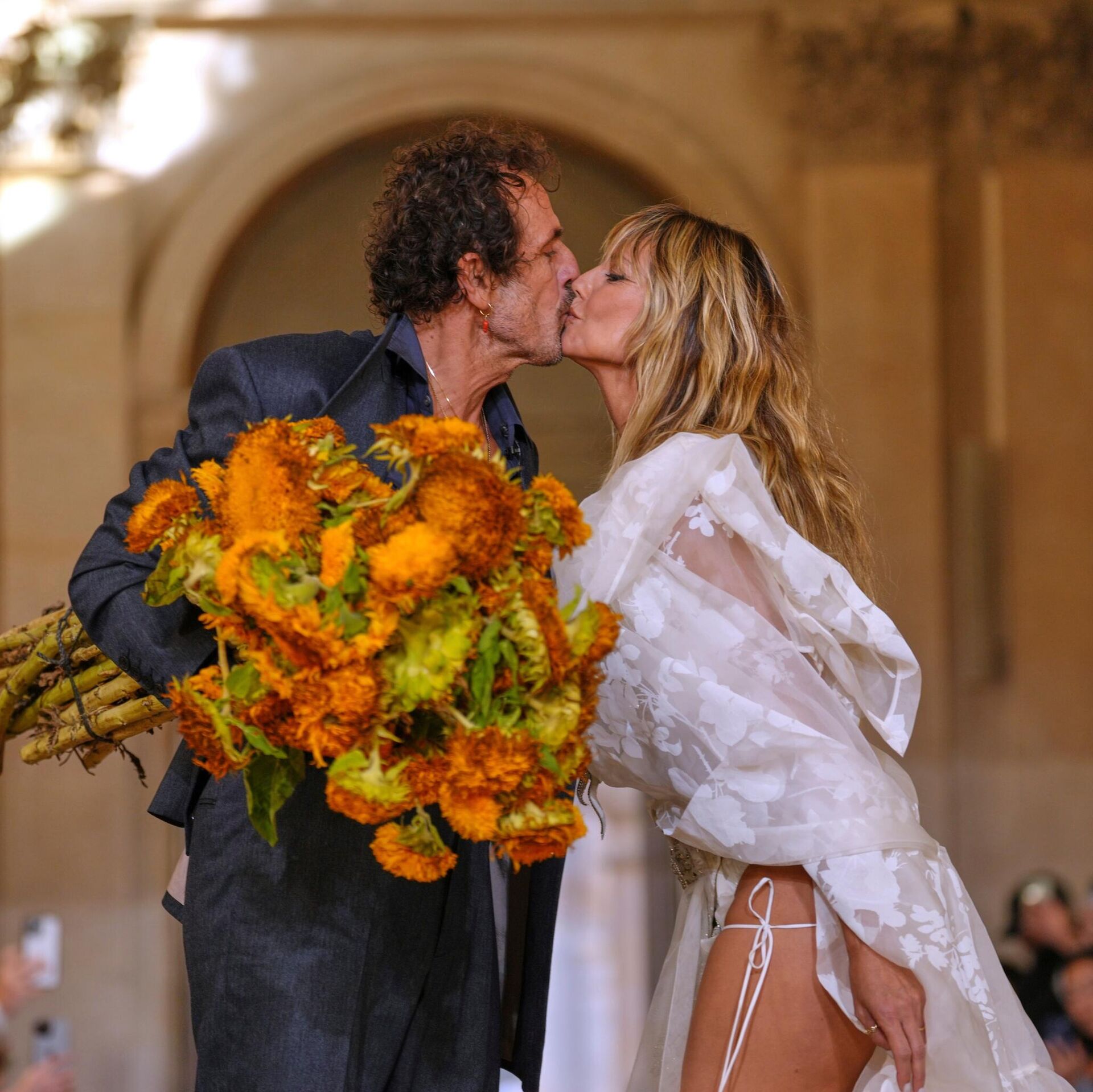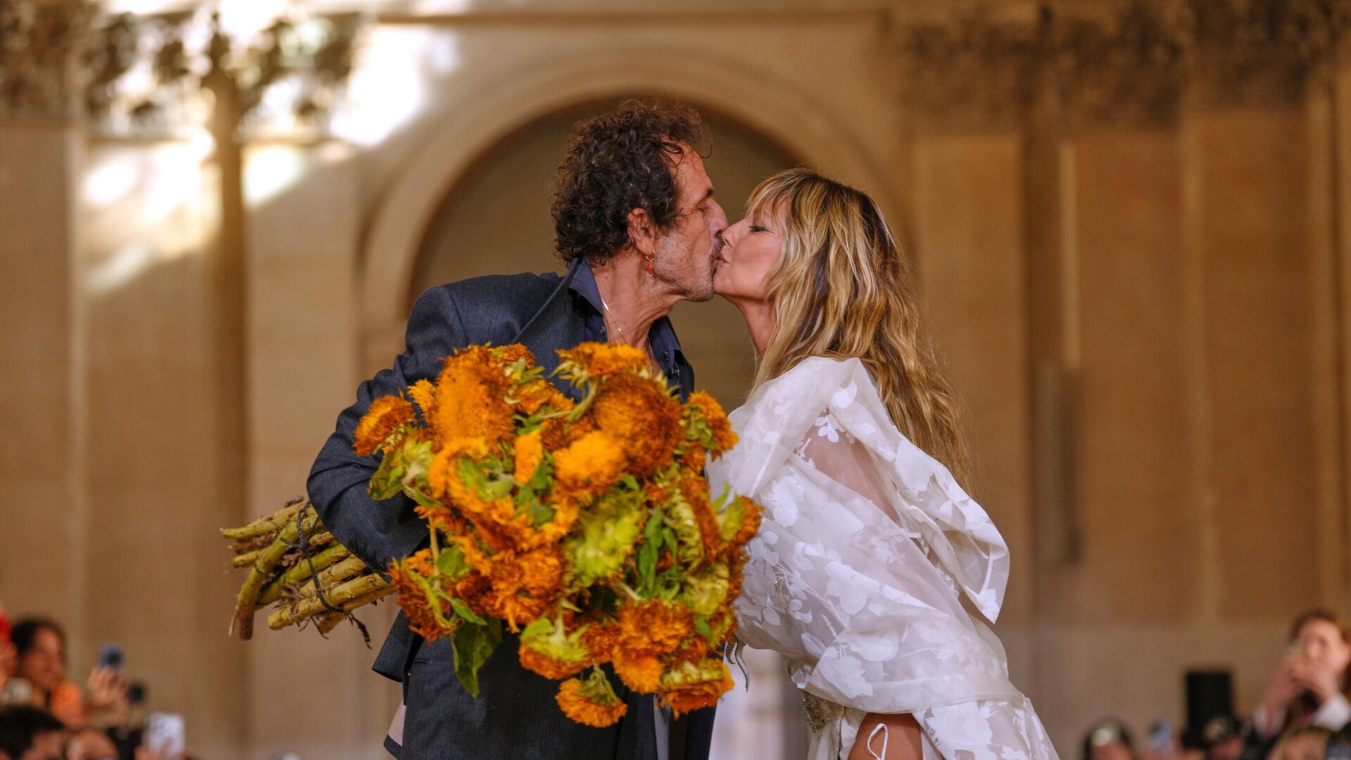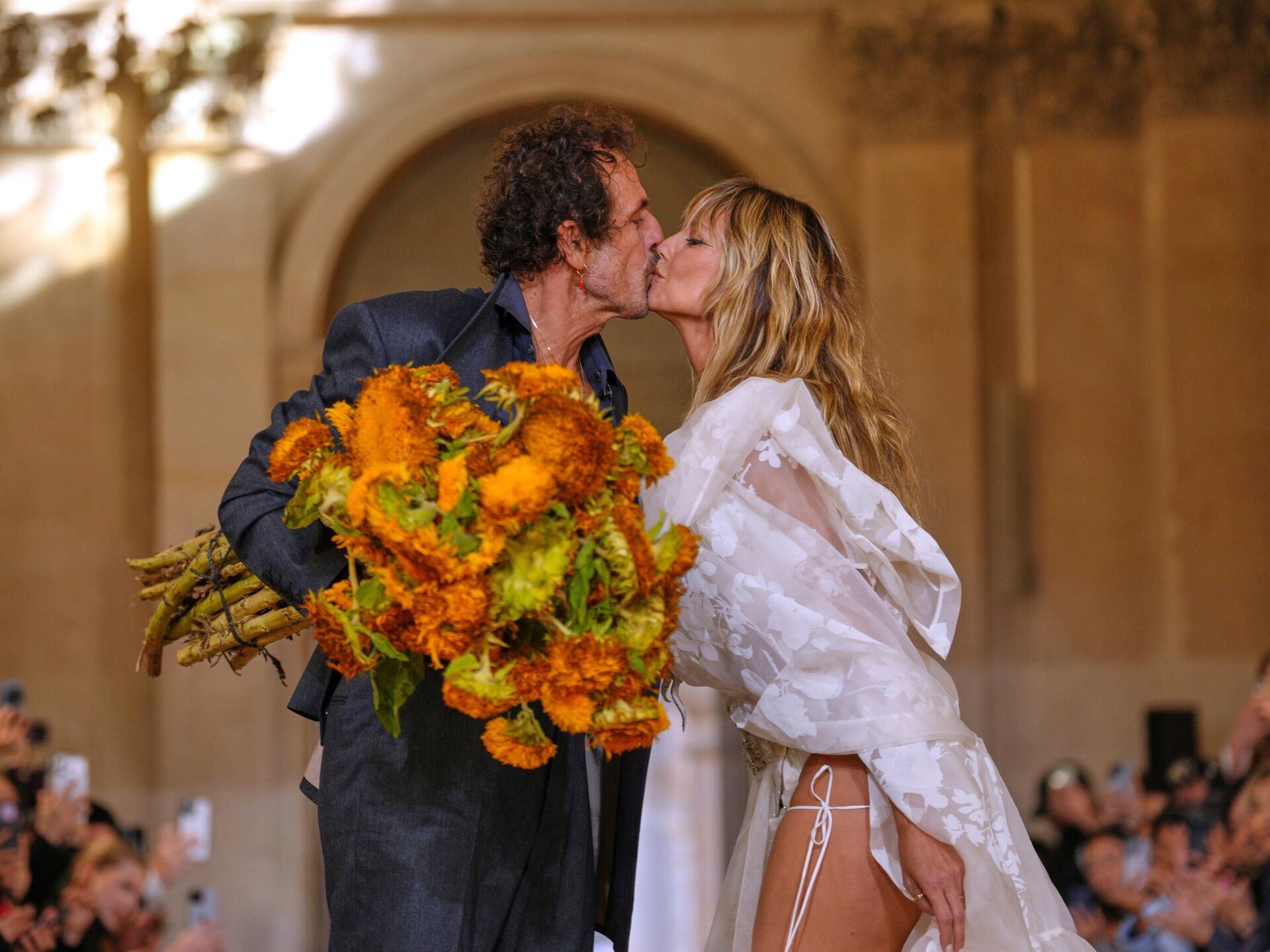 El diseñador Andreas Kronthaler dándole un beso a la modelo Heidi Klum tras el desfile de la colección de Vivienne Westwood en París.