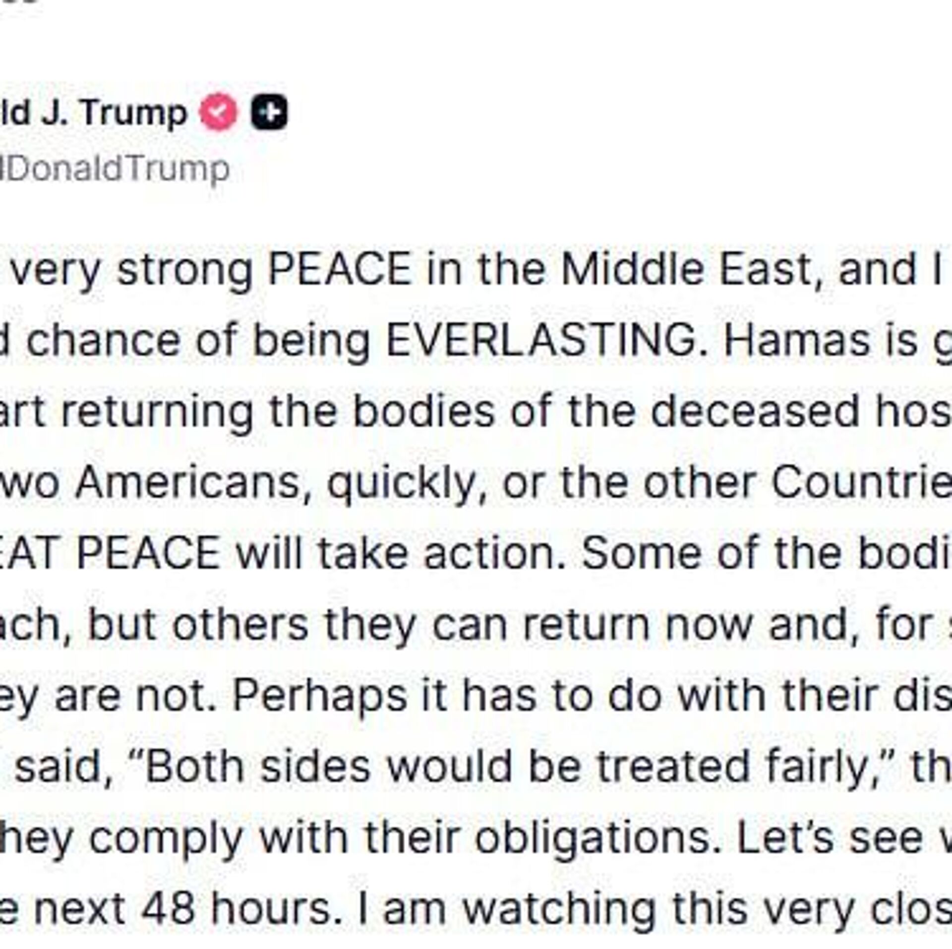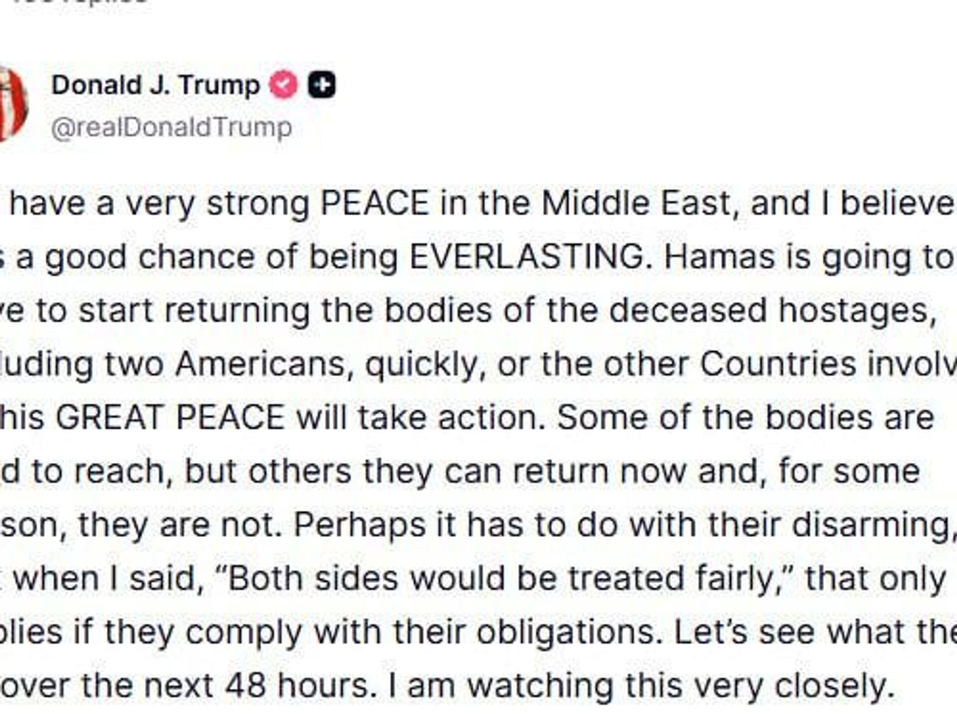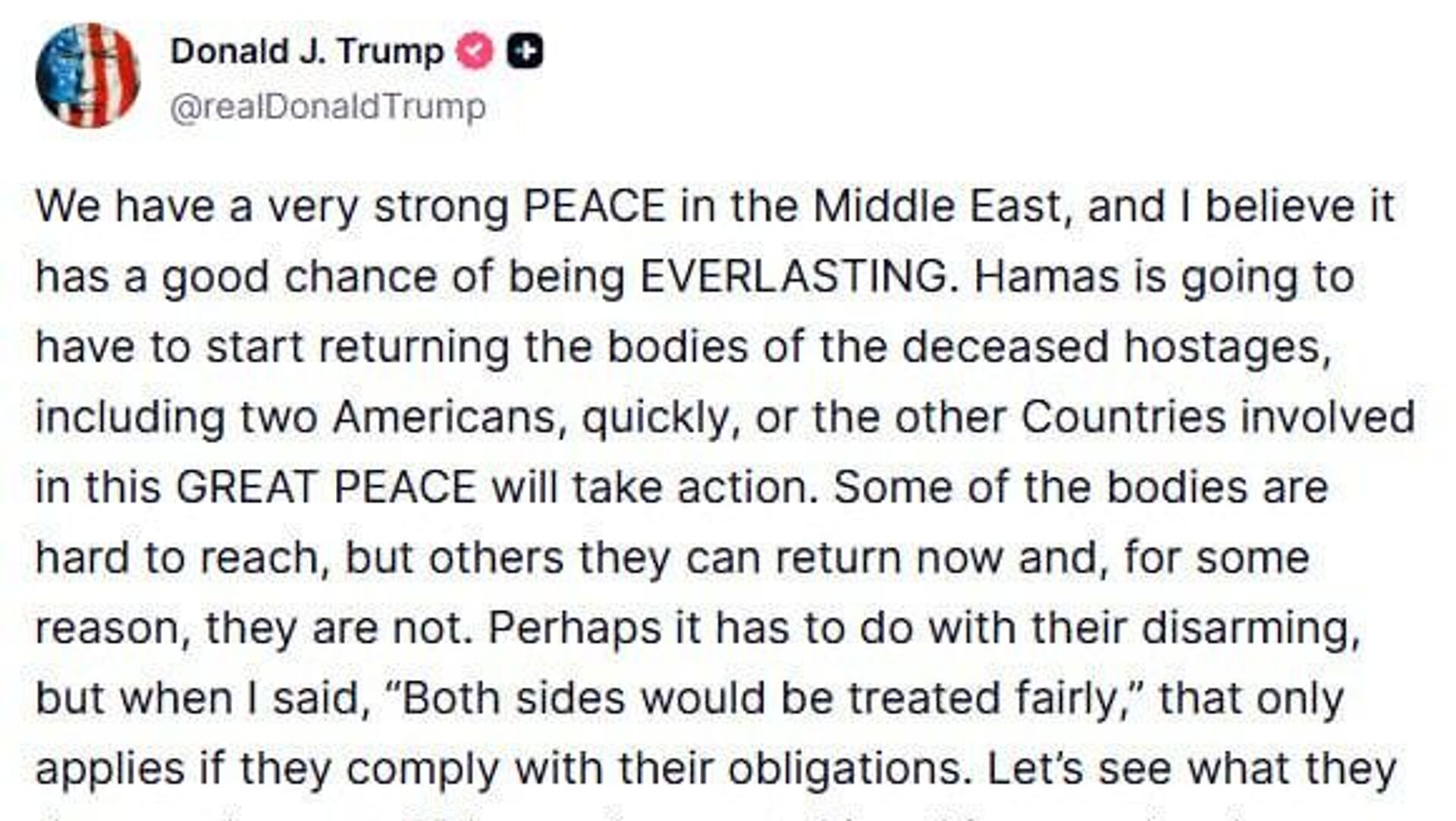 "Hamás tendrá que comenzar a devolver los cuerpos de los rehenes fallecidos, incluidos dos estadounidenses, rápidamente o los demás países involucrados en esta GRAN PAZ tomarán medidas", advirtió el mandatario estadounidense.
