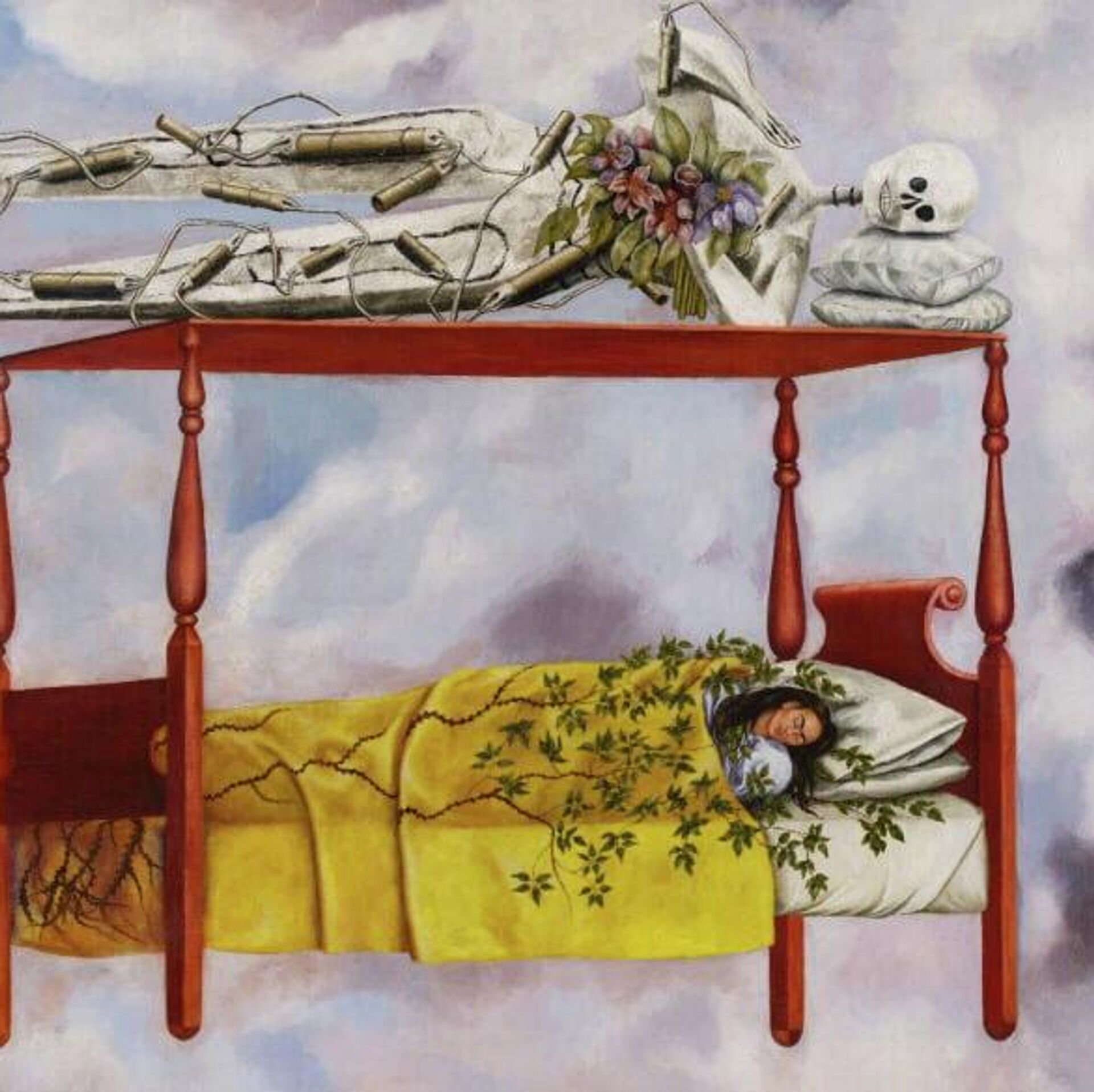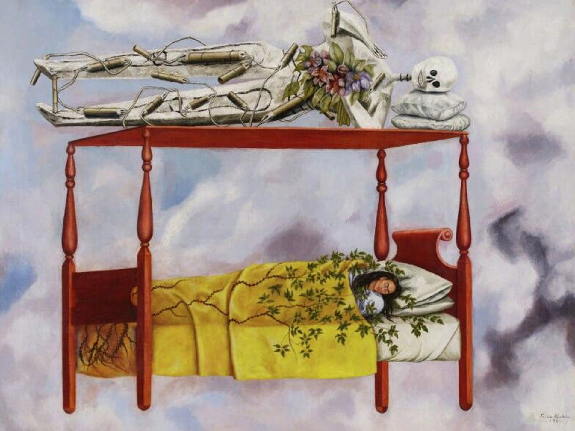 En la pintura, la autora se representa acostada en una cama de madera de estilo colonial, envuelta en enredaderas y bajo un cielo azul pálido, mientras un esqueleto con dinamita y flores reposa sobre ella. La artista comenzó a pintar durante su convalecencia tras múltiples cirugías en la columna y la pelvis, y usó corsés hasta su muerte en 1954, a los 47 años.