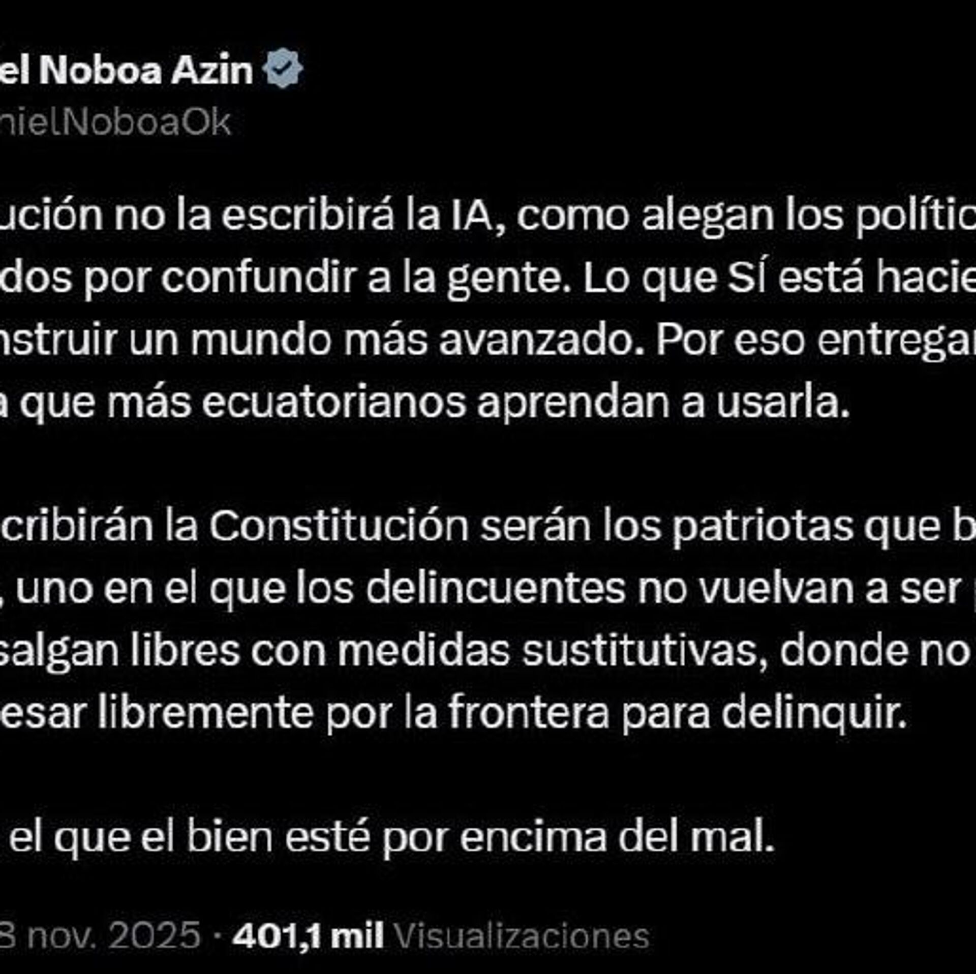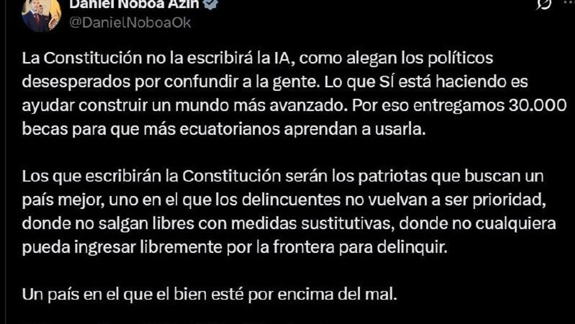 "La Constitución no será escrita por IA", aseguró el presidente ecuatoriano en una publicación en X, buscando tranquilizar a los ciudadanos.