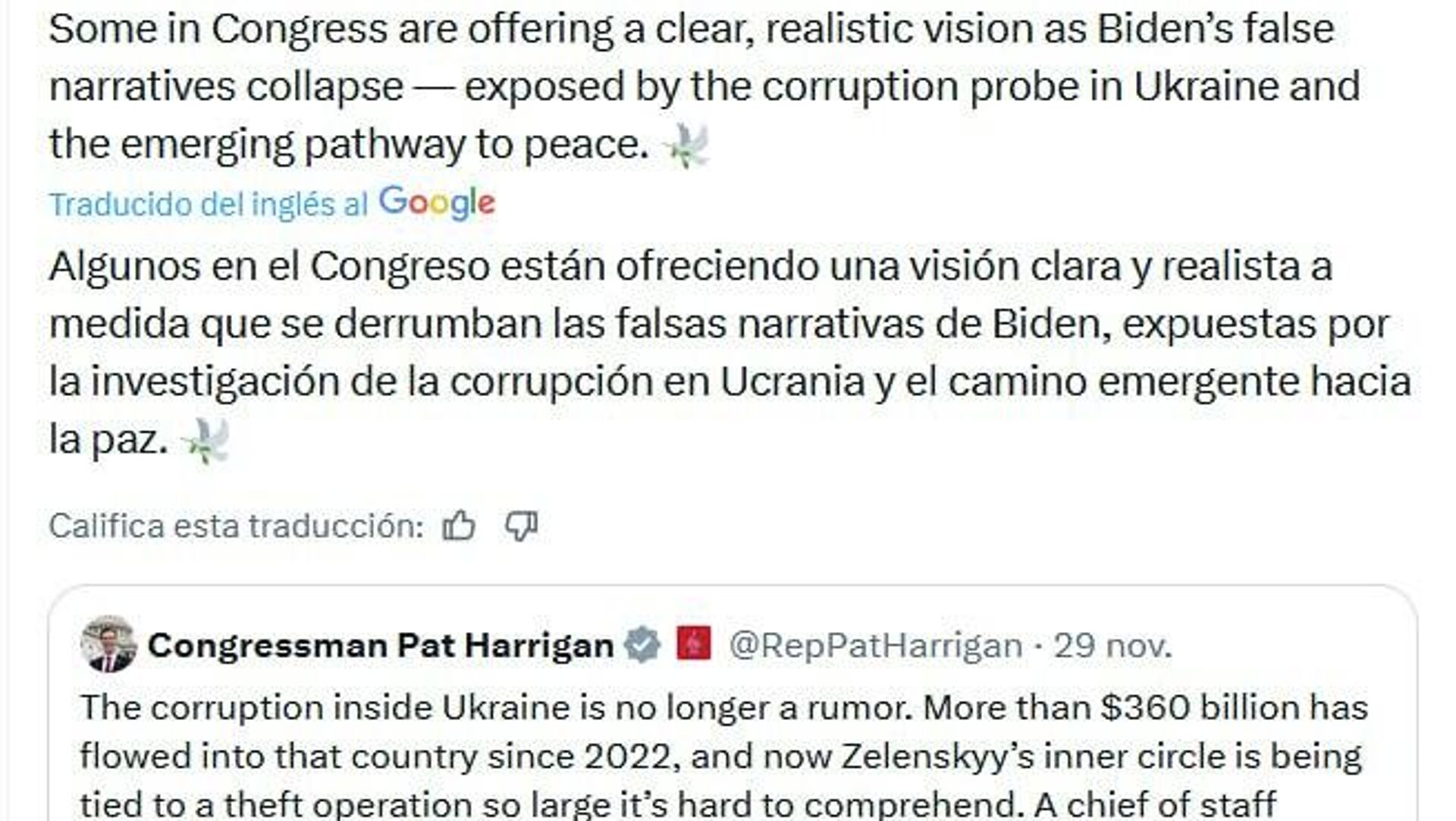 "Algunos en el Congreso están ofreciendo una visión clara y realista a medida que se derrumban las falsas narrativas de [Joe] Biden, expuestas por la investigación de la corrupción en Ucrania y el camino emergente hacia la paz", comentó al respecto Dmítriev.