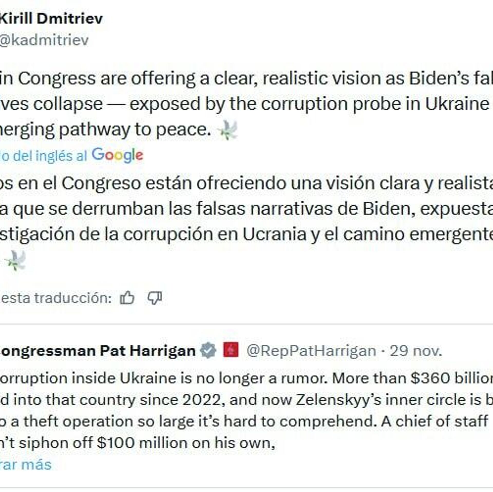 Kiril Dmítriev, enviado presidencial especial ruso, compartió en redes sociales una publicación del congresista estadounidense Pat Harris en la que señala que "la corrupción en Ucrania ya no es un rumor" y destaca que la paz está "al alcance de la mano".
