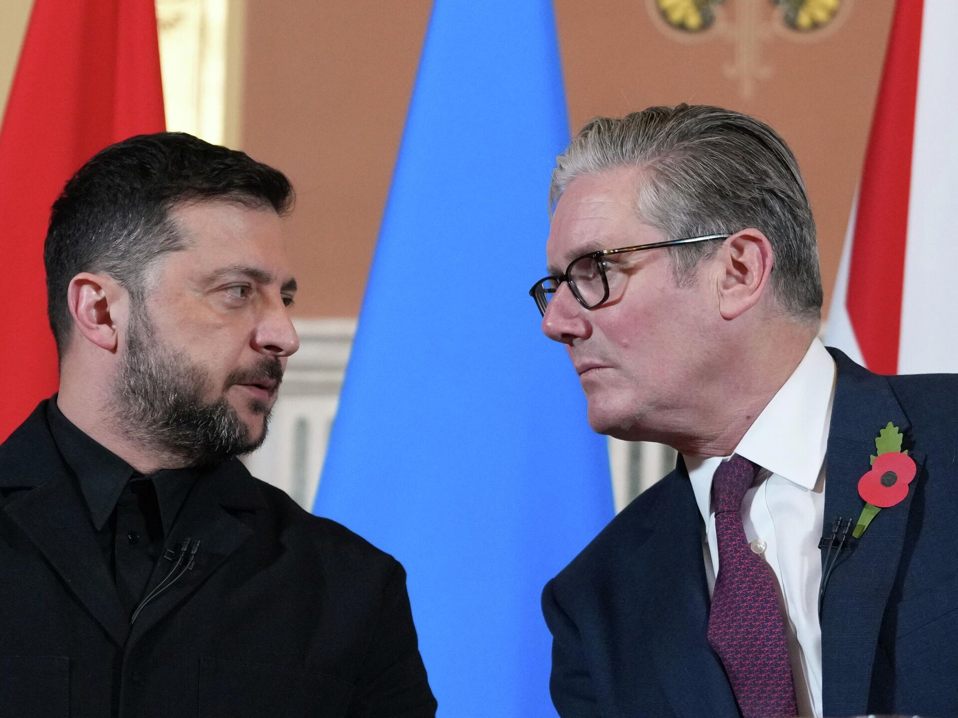 © Getty Images / WPA PoolVolodímir Zelenski, y el primer ministro británico, Keir Starmer, hablan con los medios tras una reunión de la llamada "coalición de los dispuestos" el 24 de octubre de 2025 en Londres, el Reino Unido