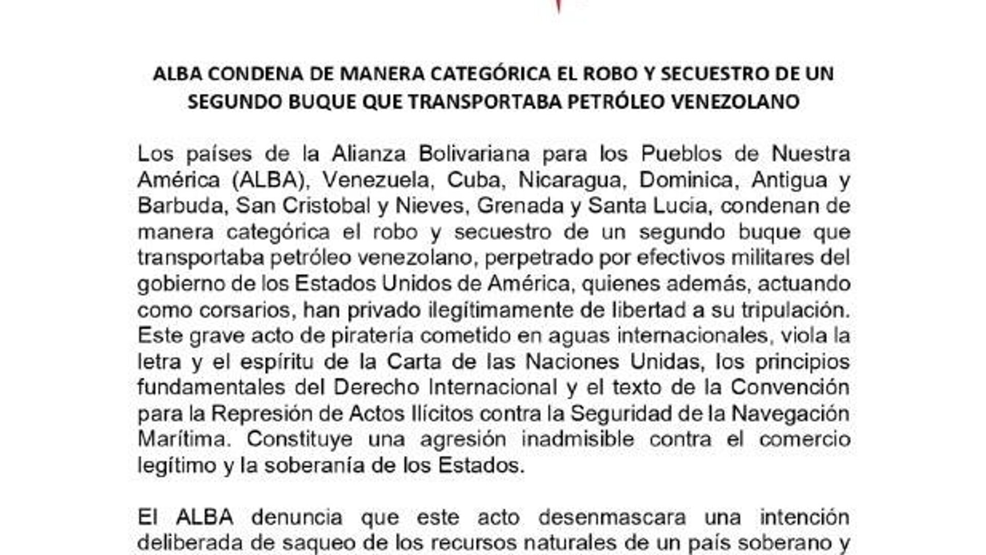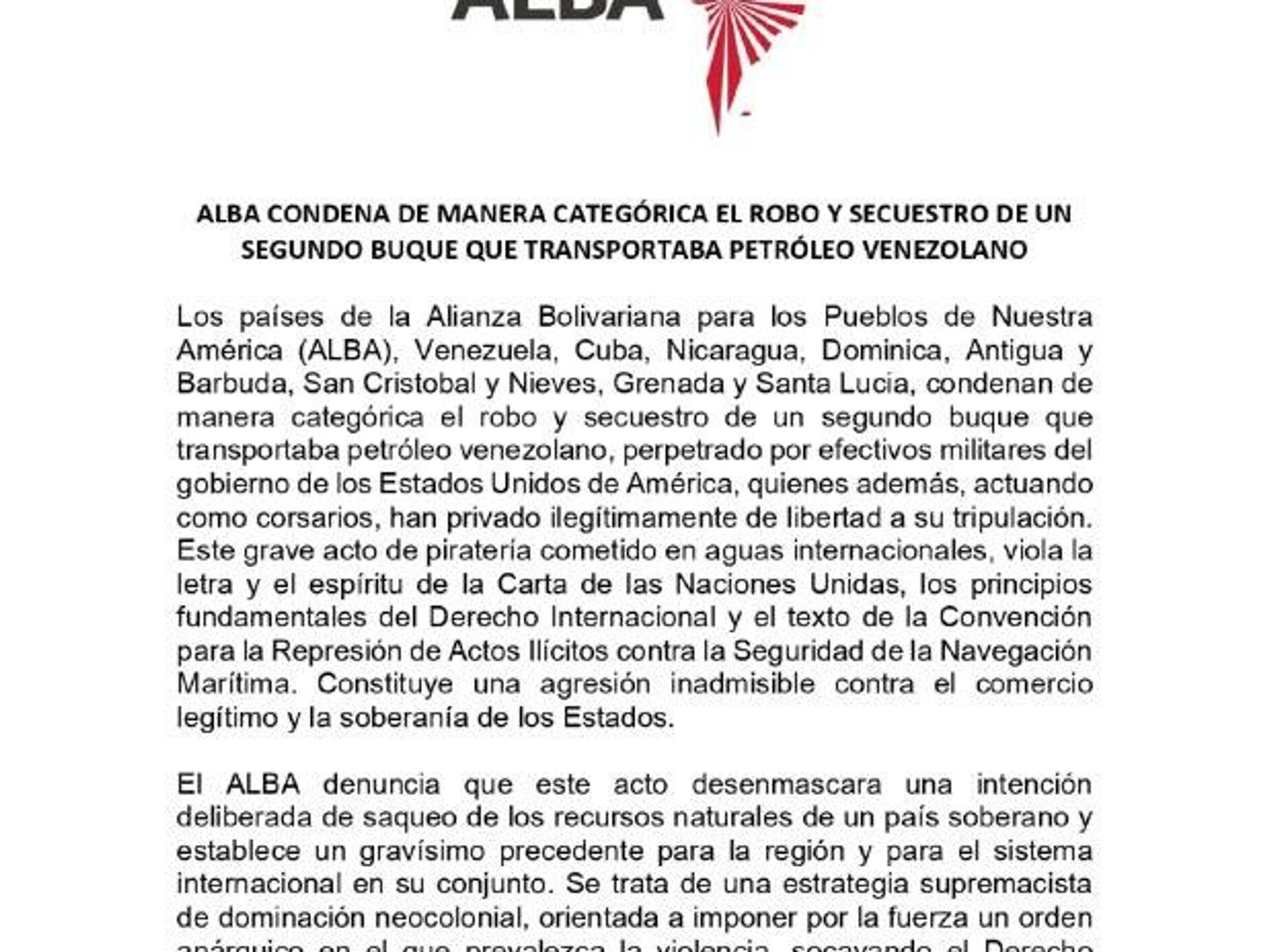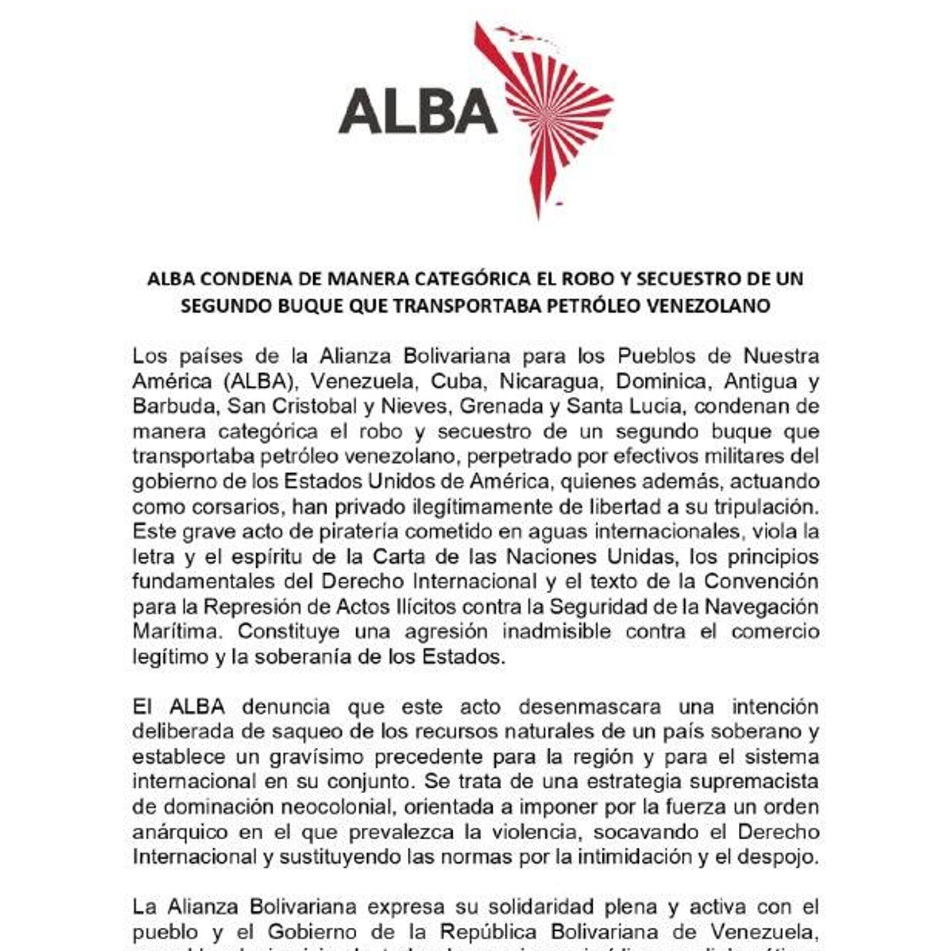 La Alianza Bolivariana para los Pueblos de Nuestra América (ALBA-TCP) repudió el "el robo y secuestro" de navíos petroleros en el Caribe, cerca de Venezuela, por parte de las Fuerzas Armadas estadounidenses.