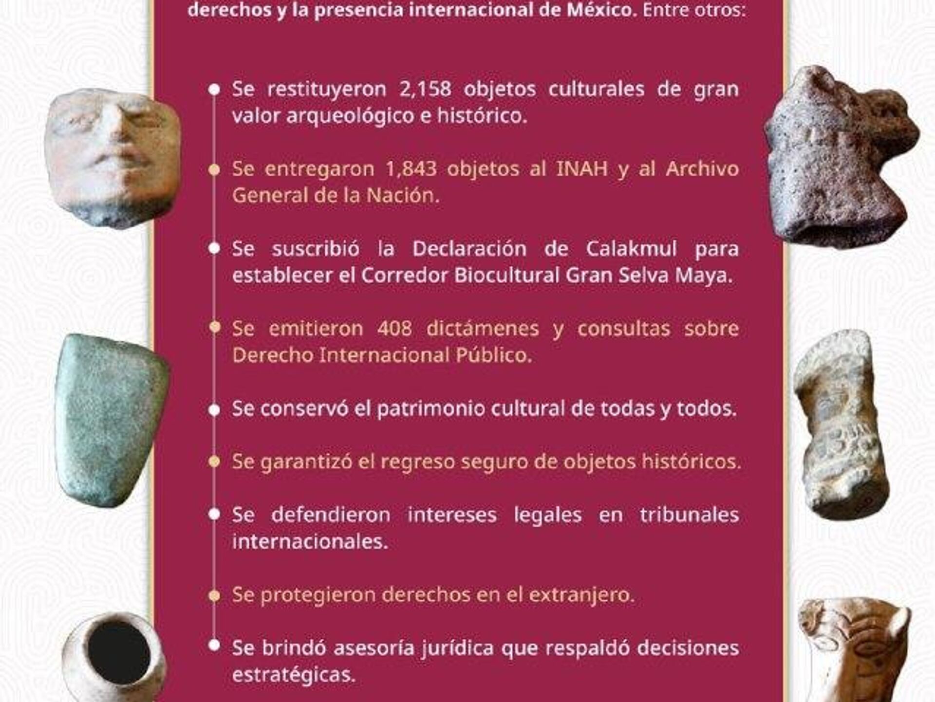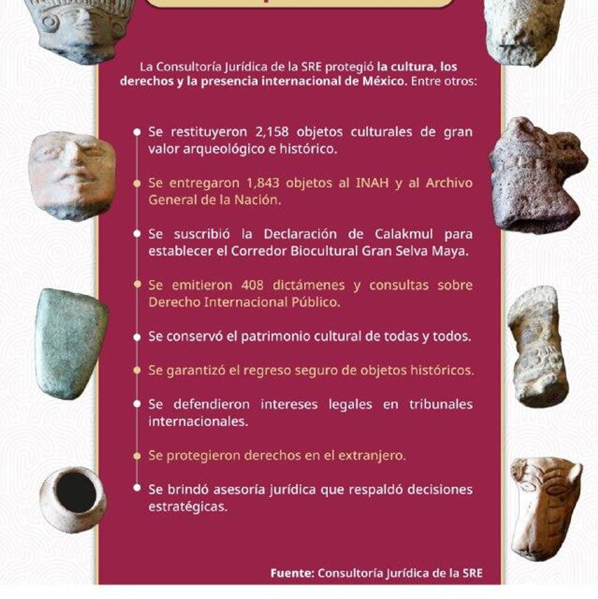 La Secretaría de Relaciones Exteriores (SRE) aseguró que un total de 2.158 objetos de valor arqueológico y documental fueron devueltos al país de forma voluntaria por particulares, instituciones académicas y museos de Canadá, Dinamarca, Estados Unidos, Francia, Italia y Países Bajos, que los tenían en su posesión.