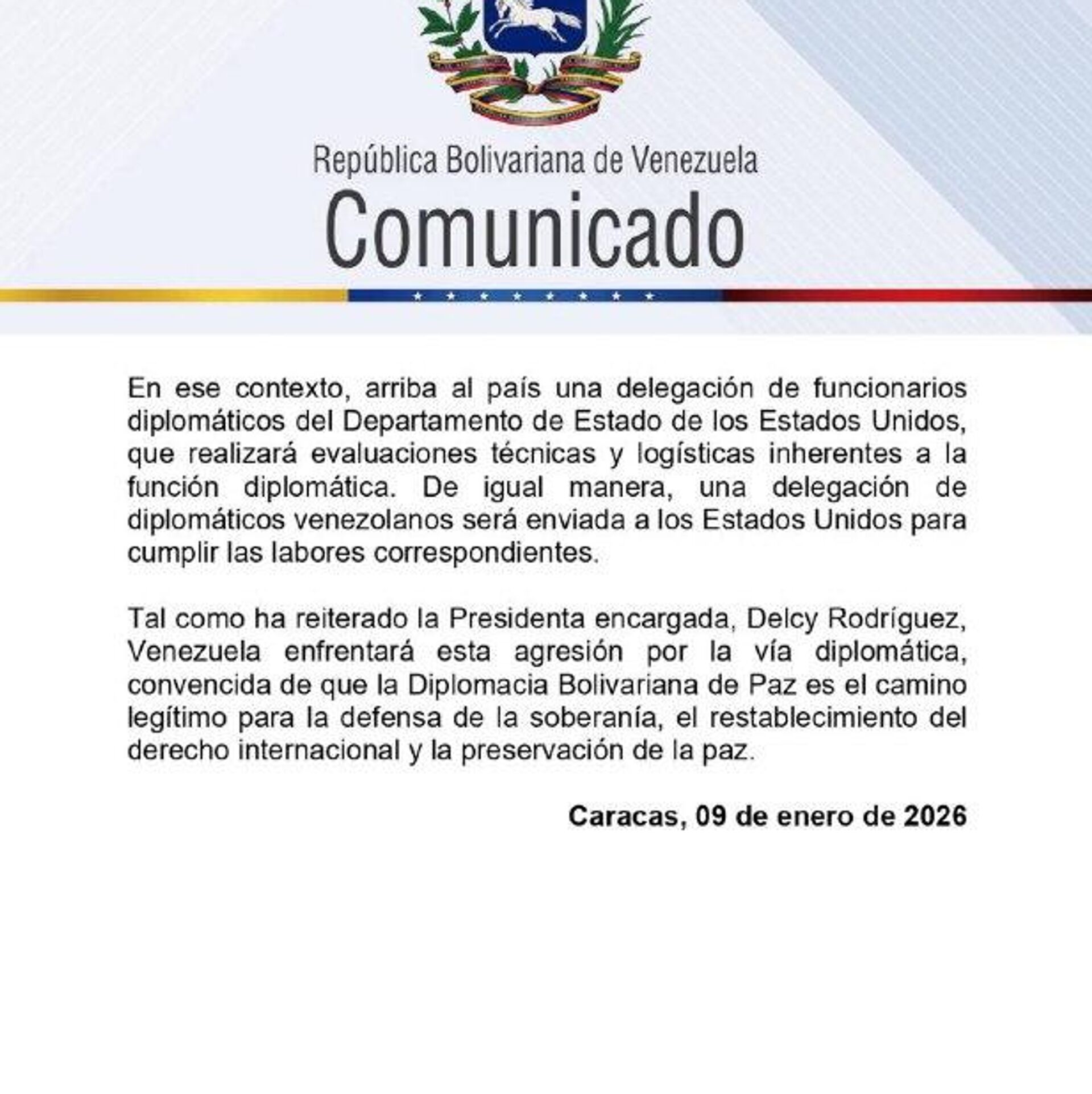 En este contexto, a Venezuela arriba una delegación de funcionarios diplomáticos de EEUU, que realizará evaluaciones técnicas y logísticas inherentes a la función diplomática, destaca Gil.