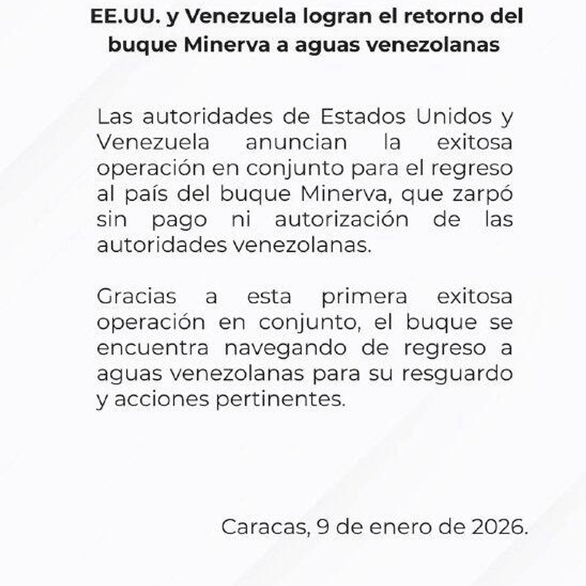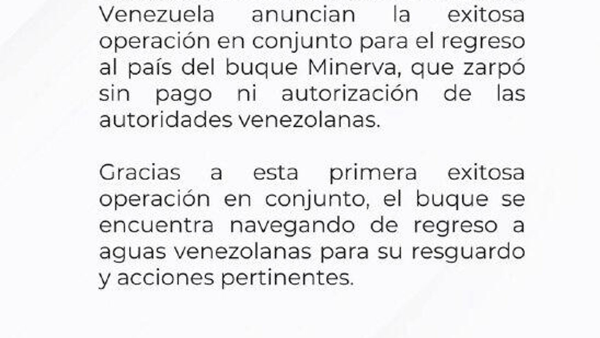 "Gracias a esta primera exitosa operación en conjunto, el buque se encuentra navegando de regreso a aguas venezolanas para su resguardo y acciones pertinentes", concluye el boletín.