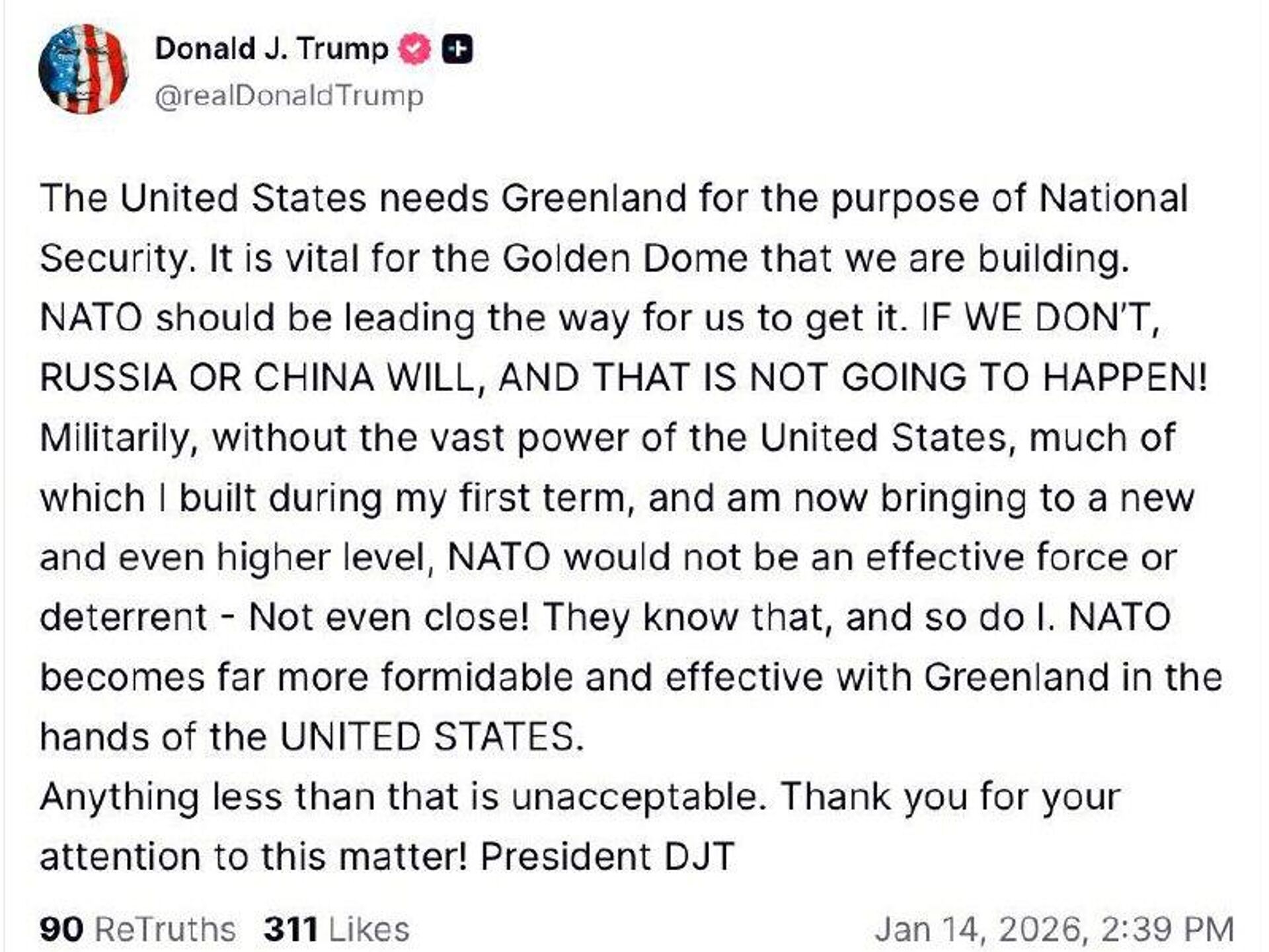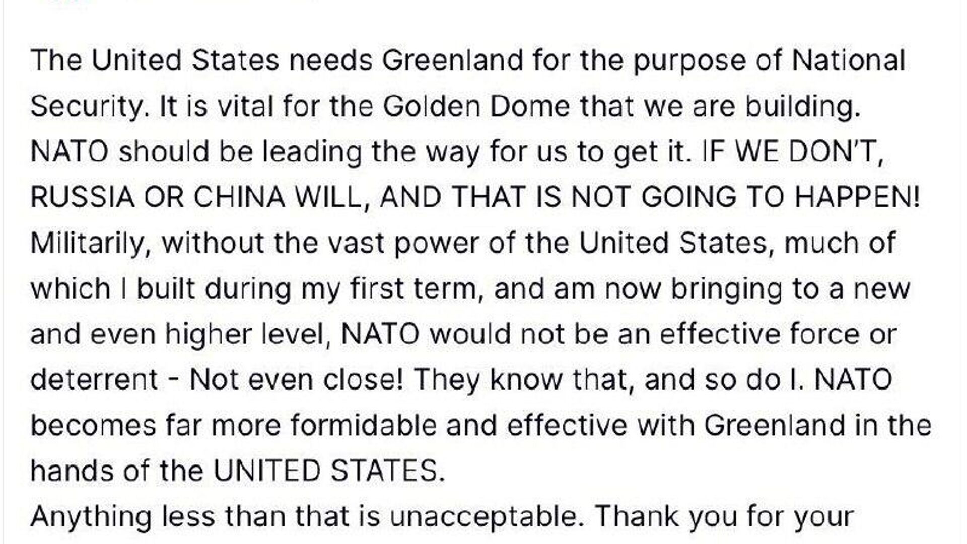 "La OTAN se vuelve mucho más fuerte y eficaz con Groenlandia en manos de EEUU. Cualquier otra opción es inaceptable", escribió.