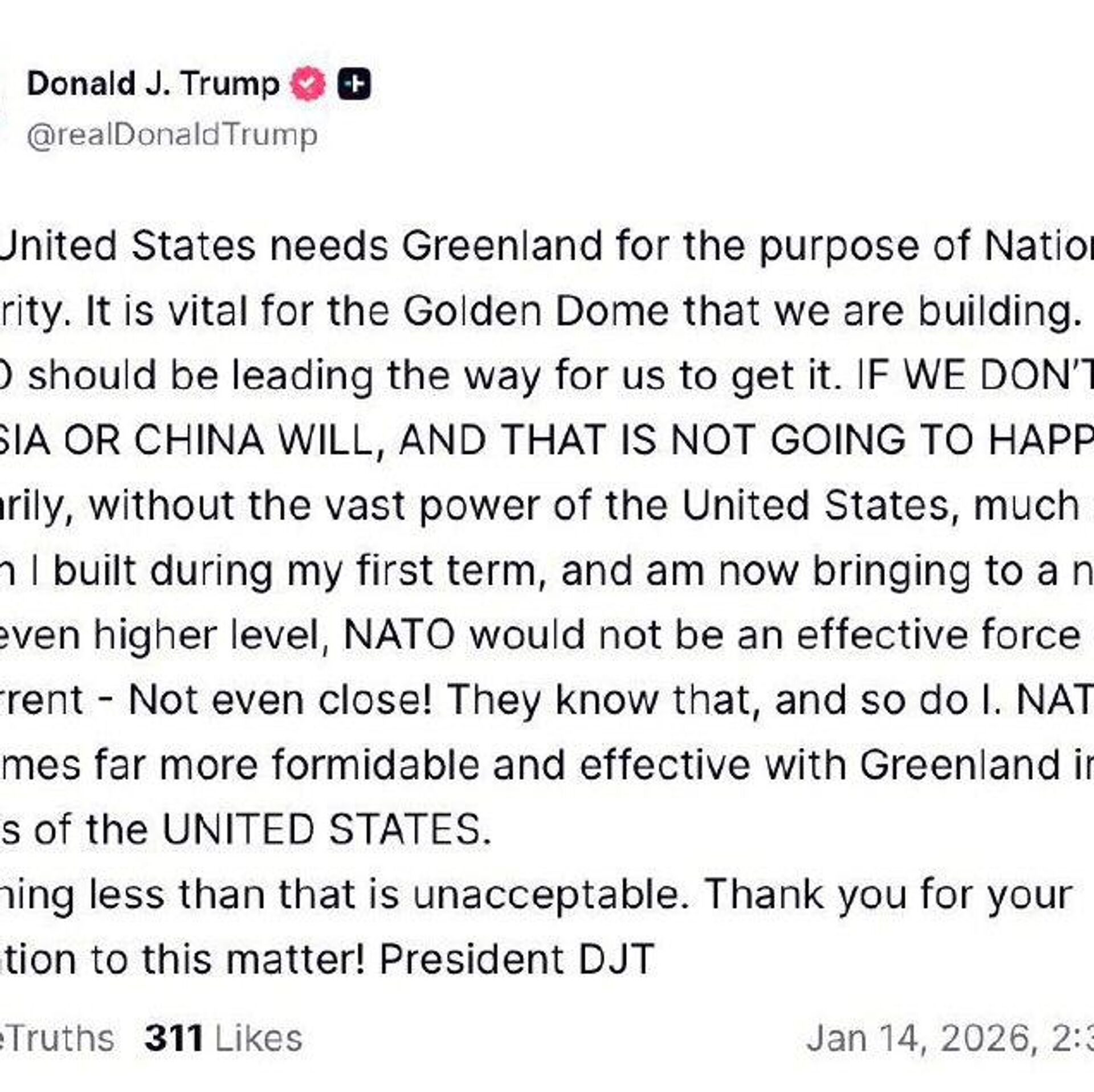 La propia OTAN debería contribuir a que Groenlandia pase a manos de Estados Unidos, declaró el mandatario en Truth Social. De lo contrario, según él, ese territorio podría acabar bajo la influencia de Rusia o China.