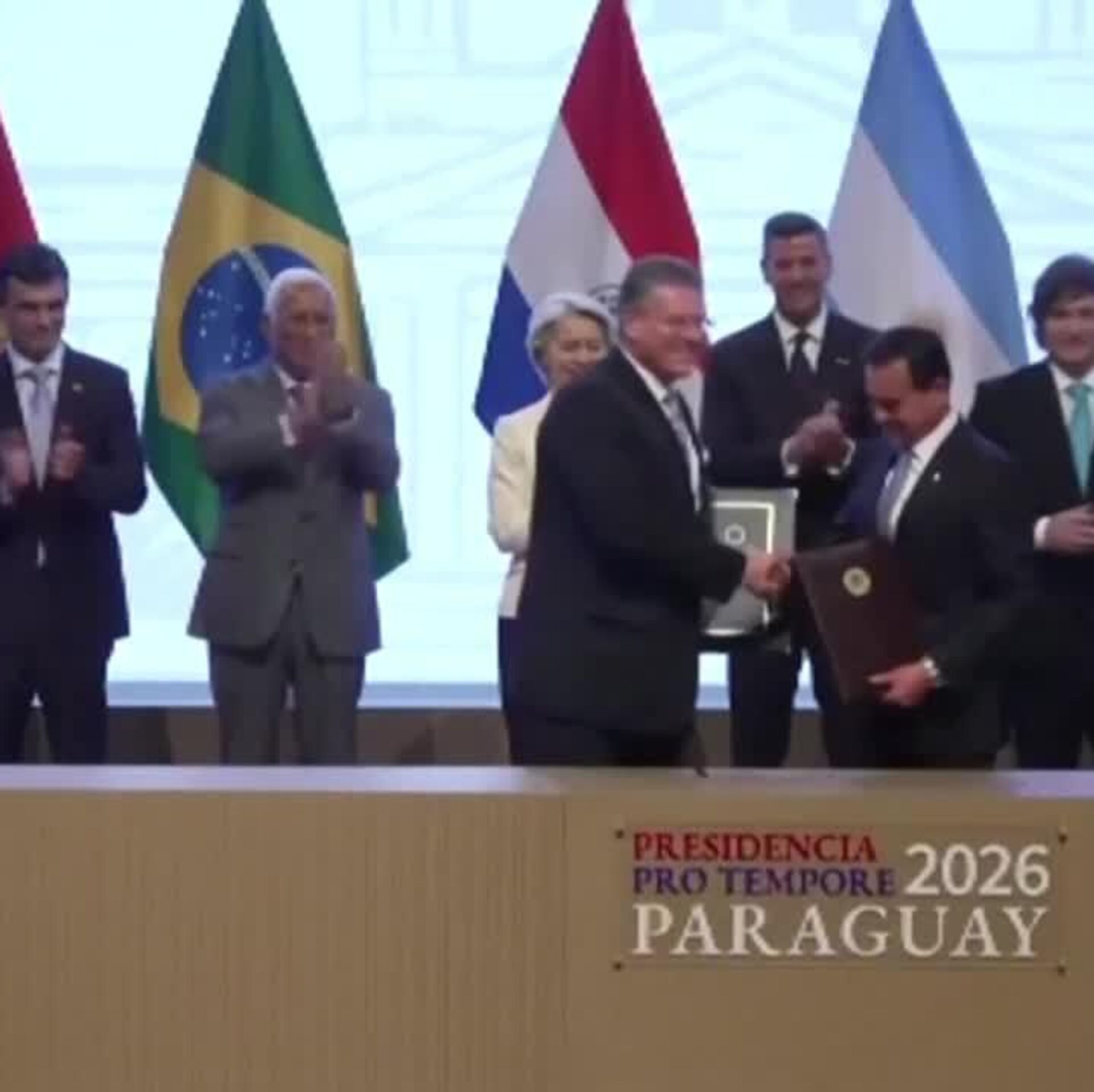 Los líderes sudamericanos y europeos sellaron el momento con apretones de manos y cálidos abrazos, con lo que simbolizaron el inicio de una nueva etapa de cooperación entre los bloques firmantes del pacto comercial.