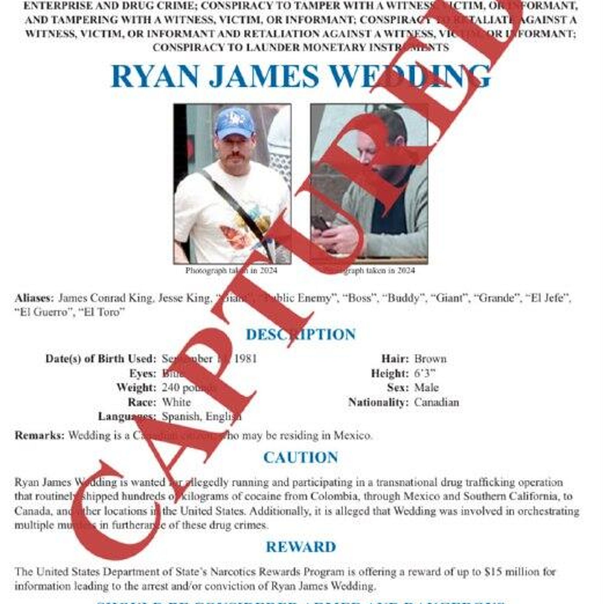 De igual manera, destacó que las autoridades de la nación latinoamericana "trabajaron en estrecha colaboración con nuestros equipos en el terreno para detener, anoche en la Ciudad de México, a Ryan Wedding".