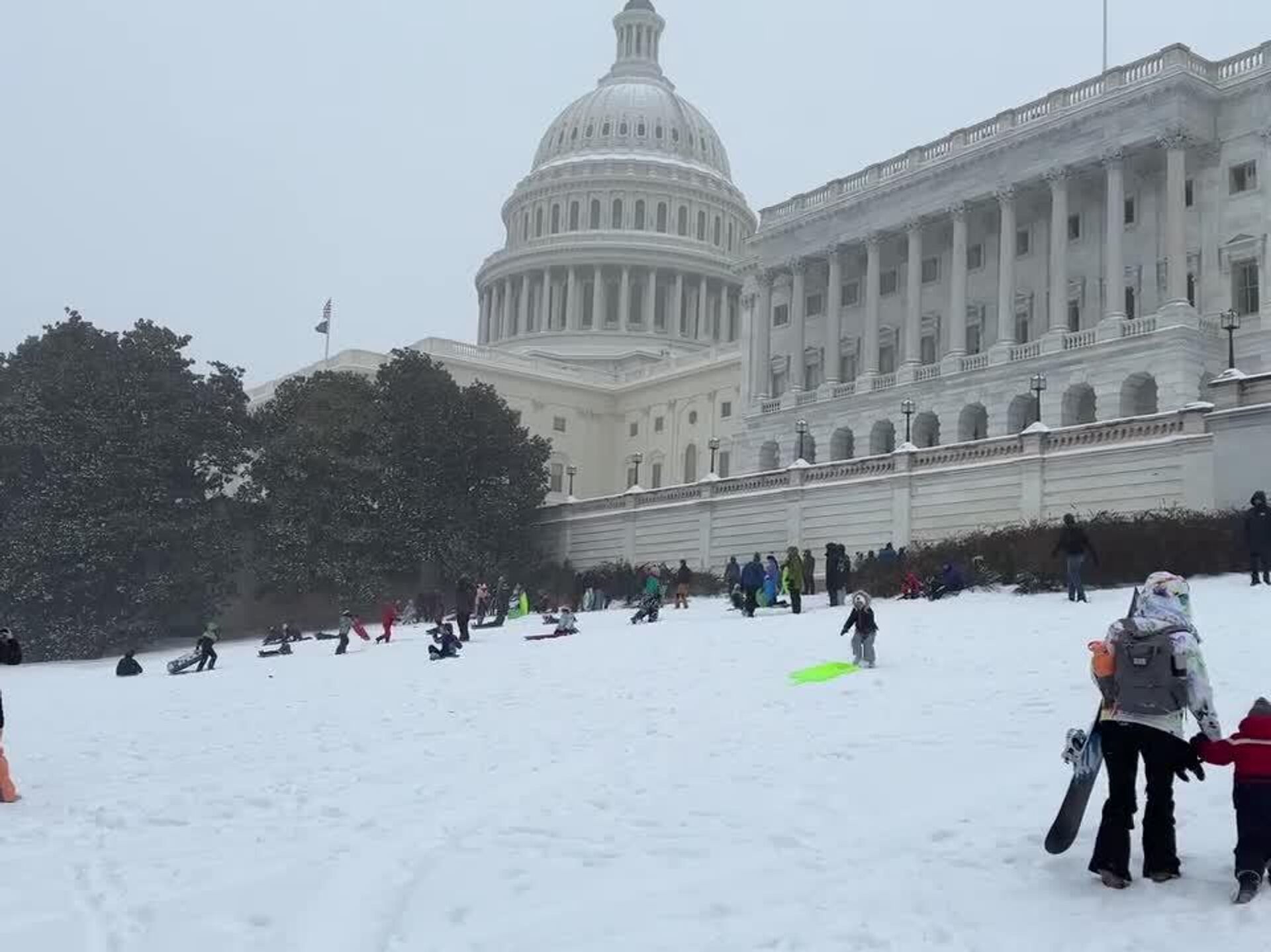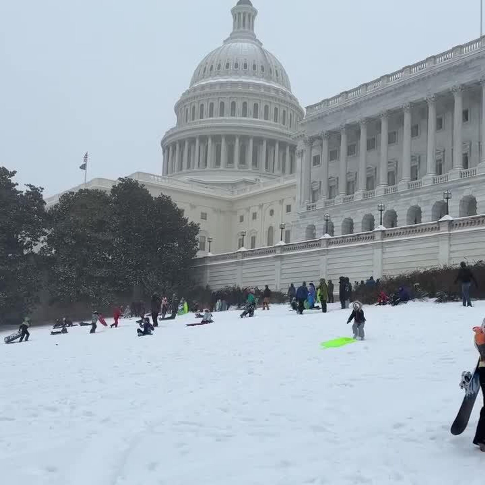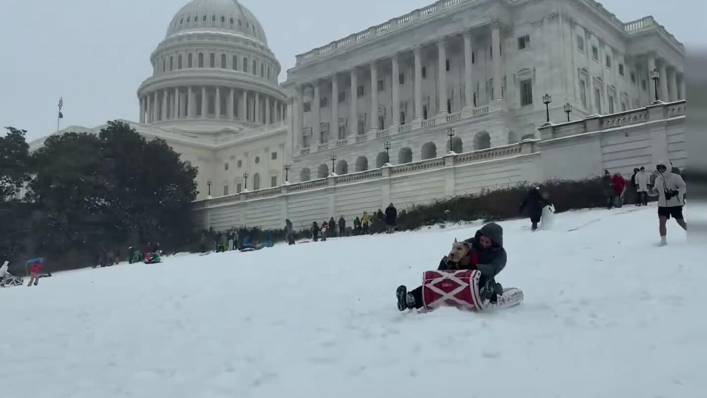 Los estadounidenses disfrutaron la nieve que rodeó a la sede del Congreso en Washington D. C. para deslizarse en sus tablas de snowboard.