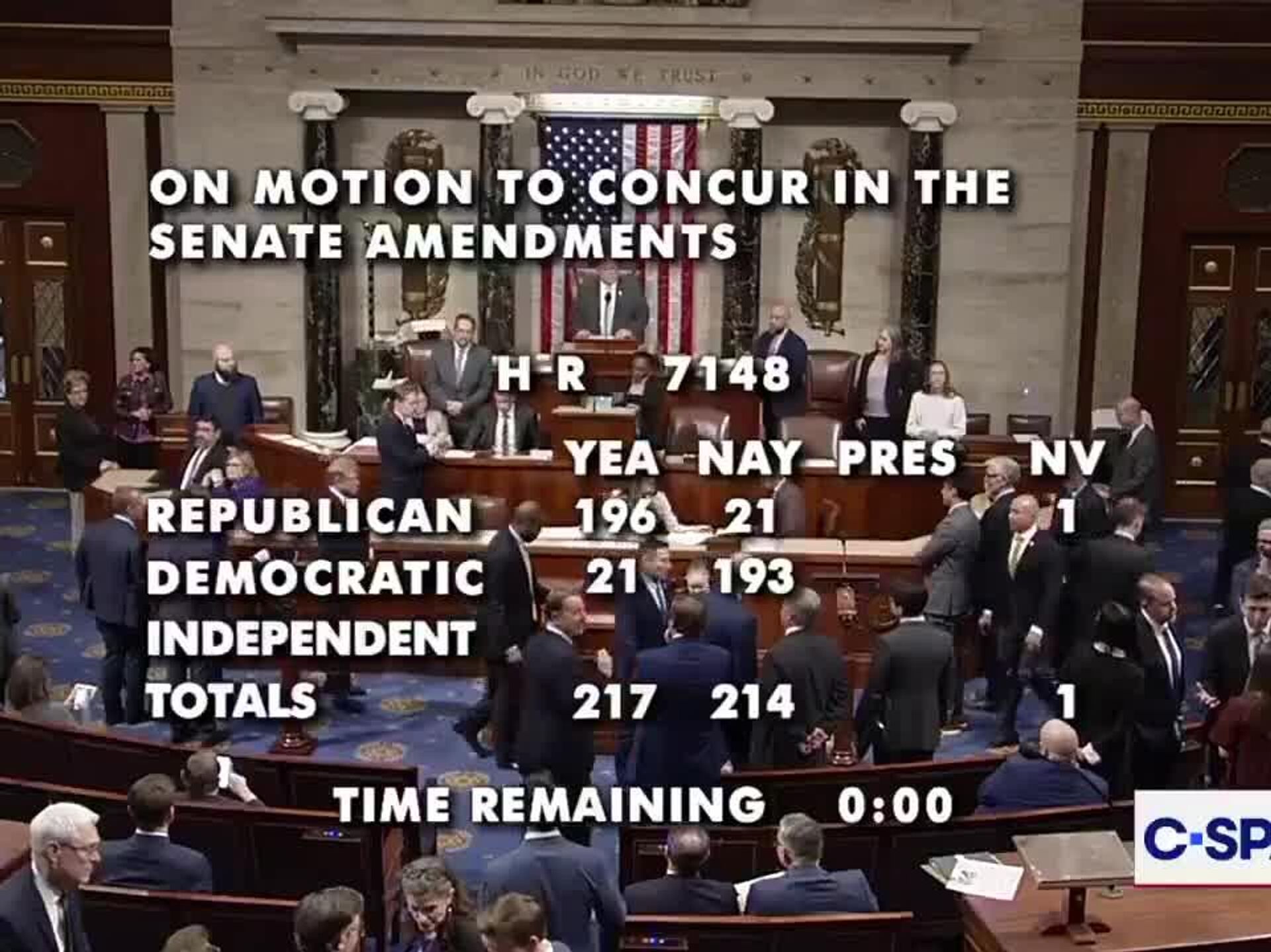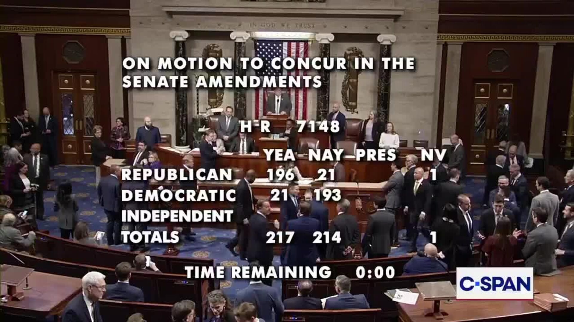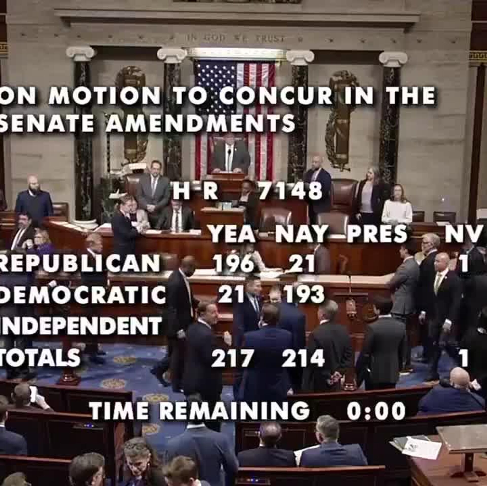 La medida fue aprobada por 217 votos a favor y 214 en contra y mantiene aproximadamente el 97% del Gobierno federal financiado hasta el 30 de septiembre, tras su aprobación previa en el Senado. Según el informe, Trump instó a los republicanos de la Cámara a que le enviaran el proyecto de ley sin modificaciones para que el cierre sea breve.