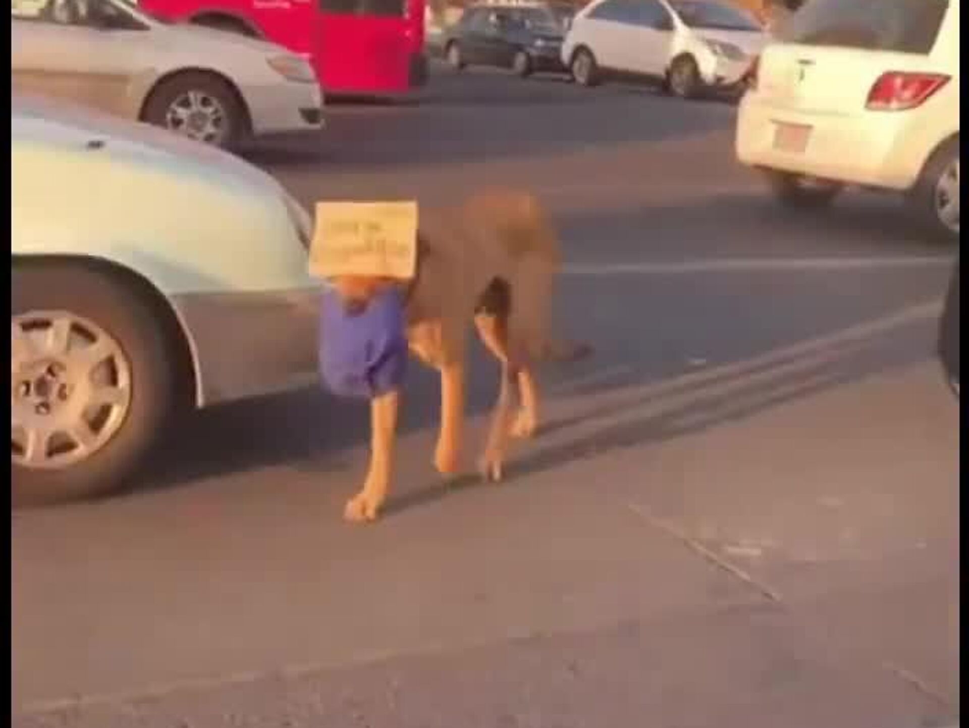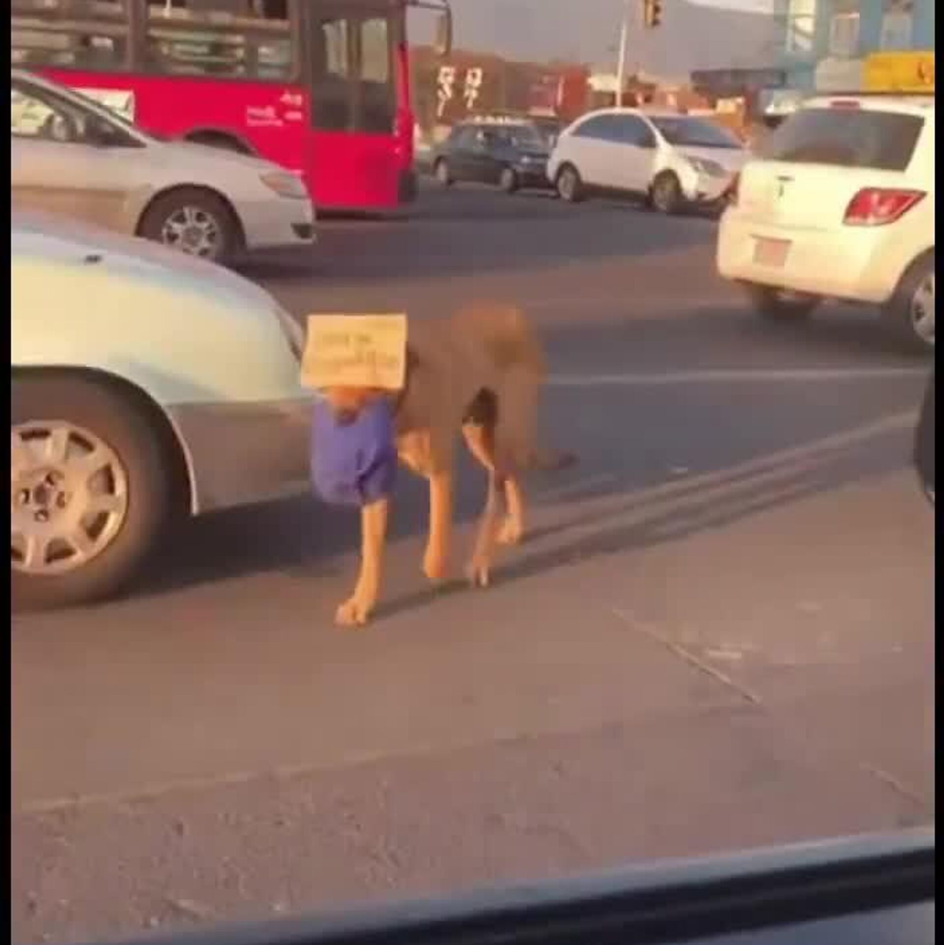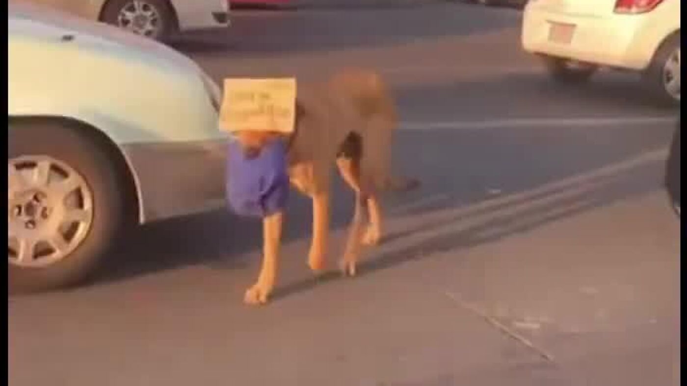 El animal aprovecha el tráfico vehicular para acercarse a los vehículos sin arriesgarse, aunque el cartel que carga le cubre los ojos.