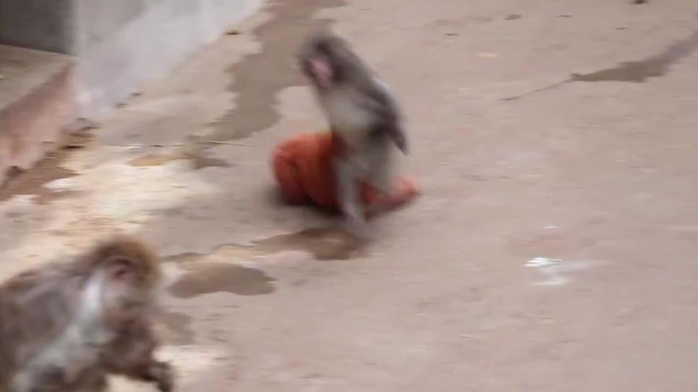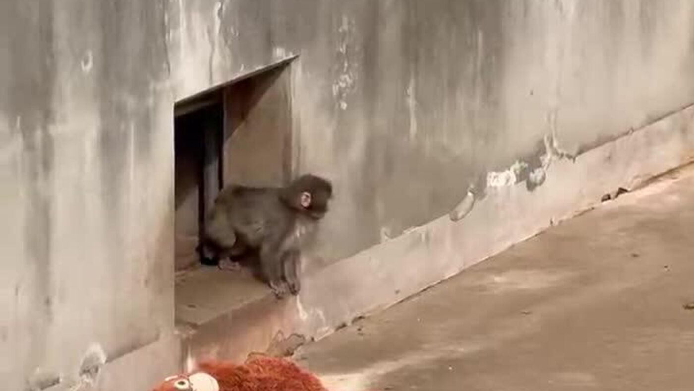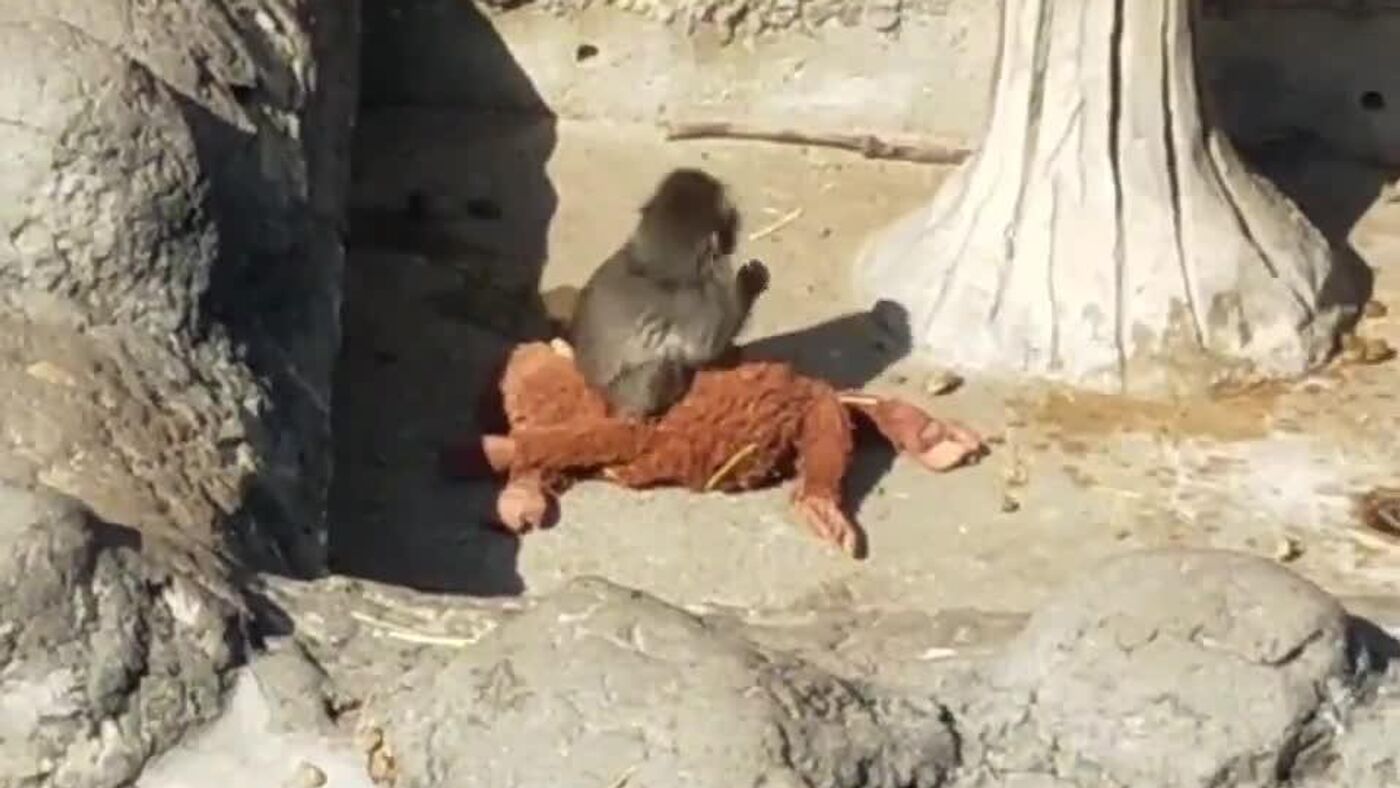 El pequeño fue integrado al recinto de los monos a mediados de enero y, desde entonces, exhibe un comportamiento diferente al de otros críos de su edad, aferrándose al juguete como fuente de seguridad.