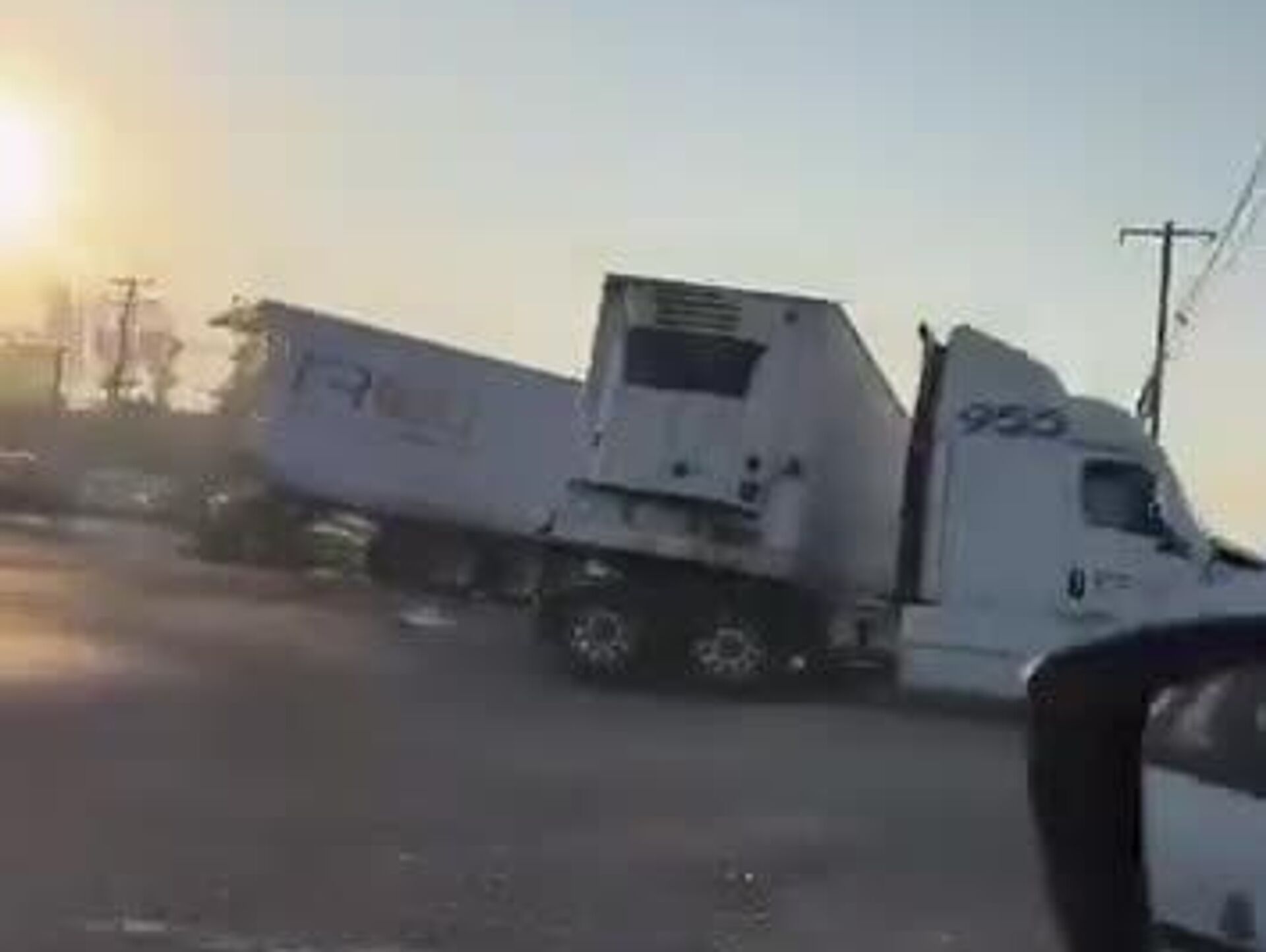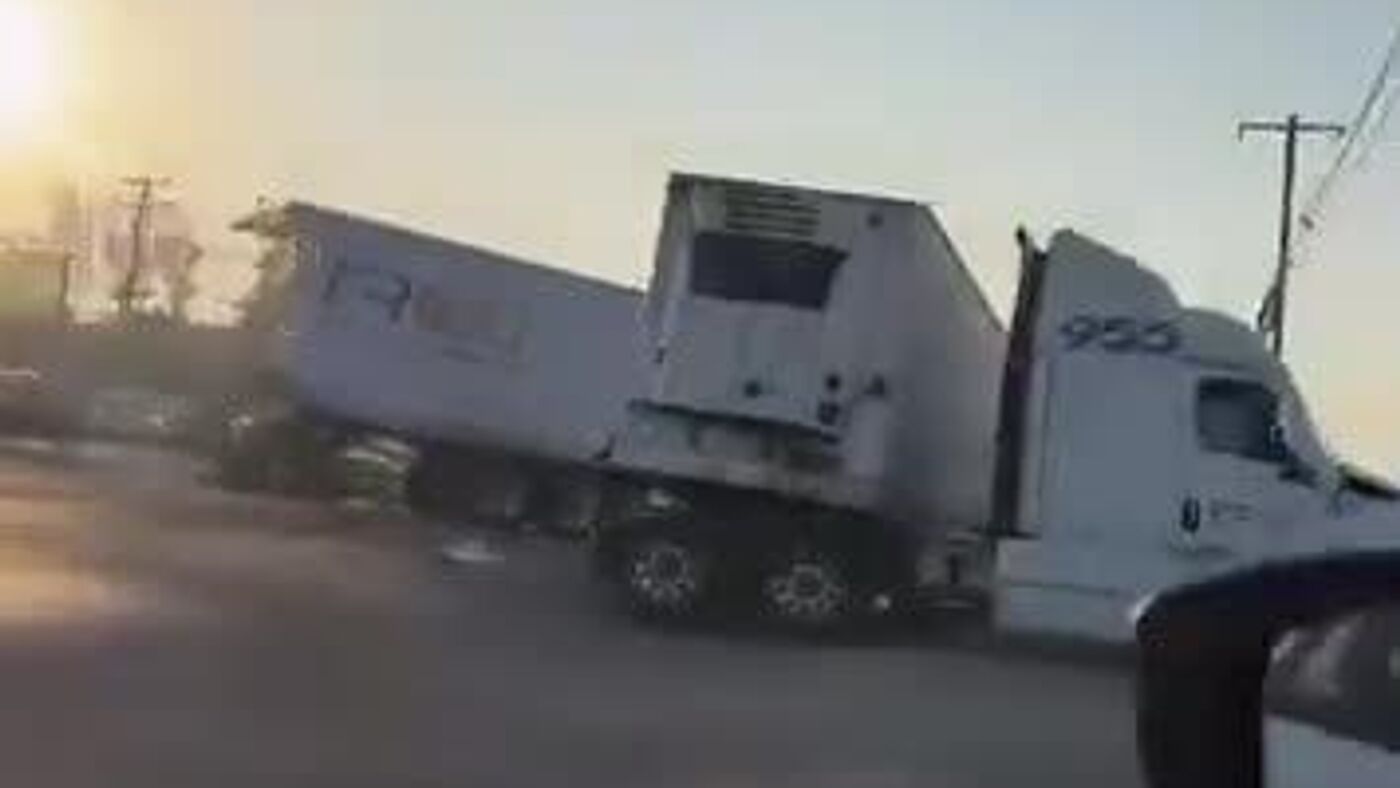 Camión de carga parte la caja de un tráiler en plena vialidad