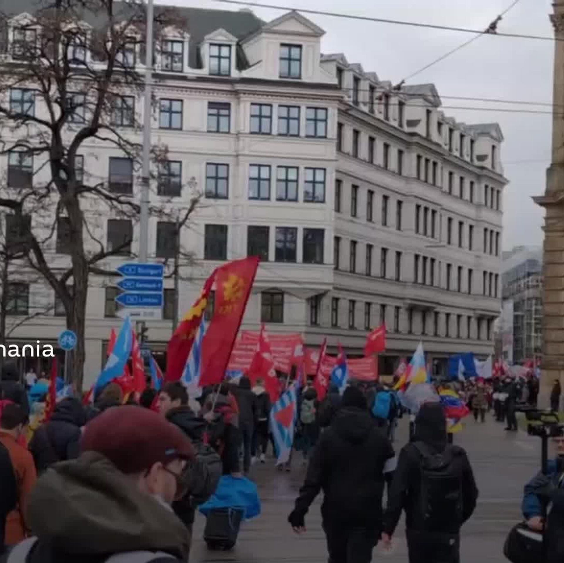‼ Los manifestantes portan banderas de amistad germano-rusa, banderas palestinas, cubanas y venezolanas, pancartas y carteles que exigían la paz y el cese del suministro de armas a Ucrania e Israel. Los participantes planean rodear la sede de la conferencia.