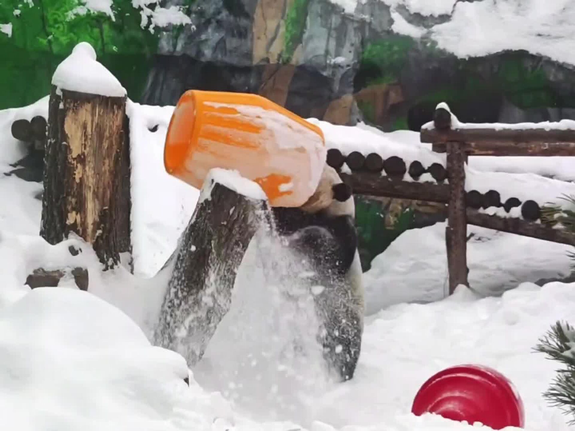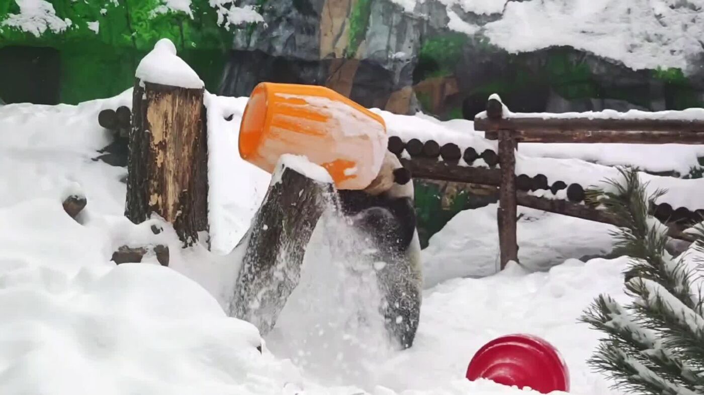 Saltos, giros y mucha nieve: así celebra el panda Dindin del zoológico de Moscú el final del invierno