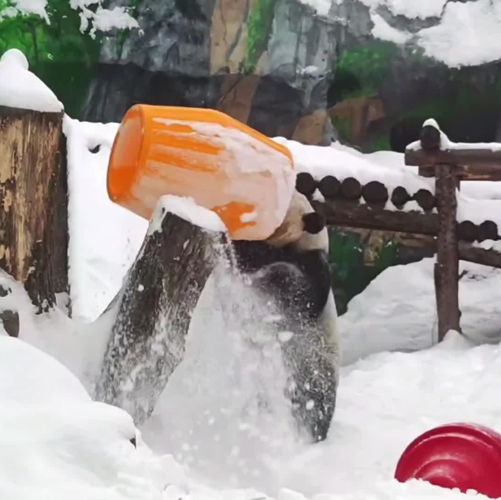 En las entrañables imágenes compartidas por la institución se ve a Dindin retozando en la blanca alfombra invernal y empujando sus juguetes con desbordante energía.