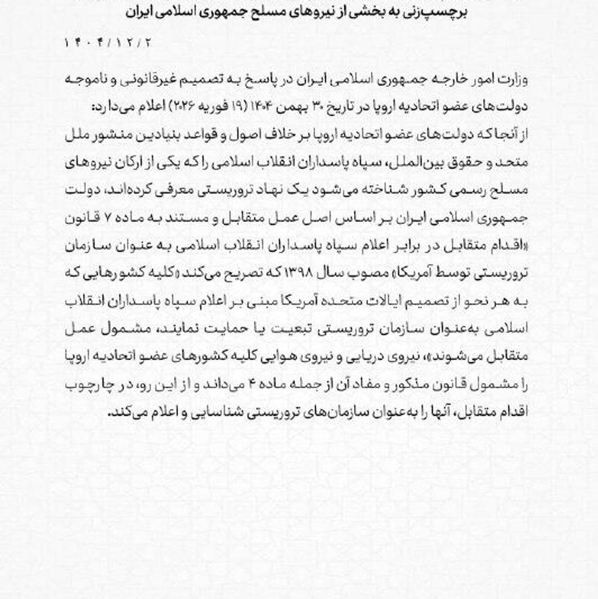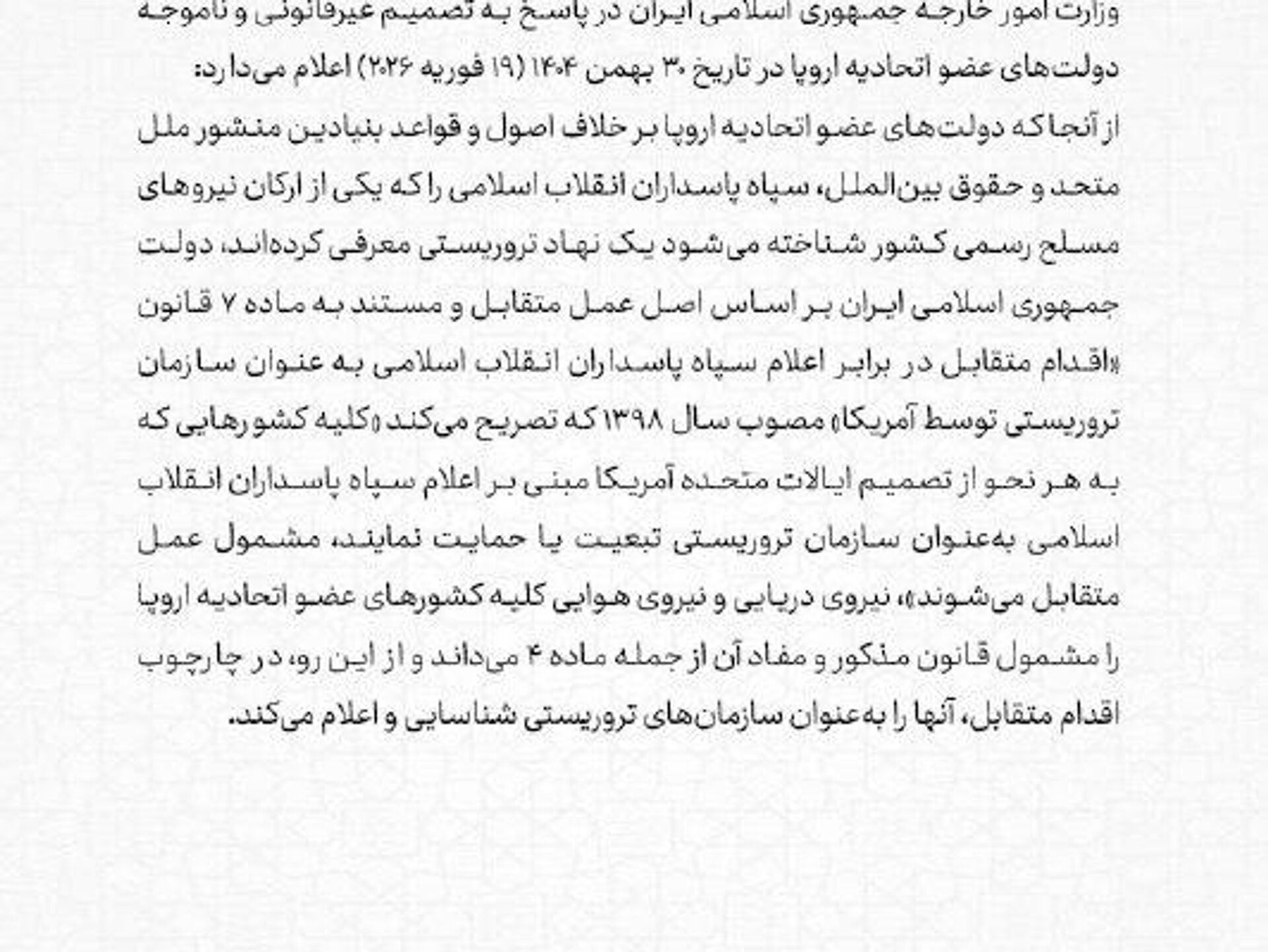 Para Irán, esa acción fue "ilegal e injustificada". Ante ello, invocando el principio de reciprocidad y su ley de contramedidas de 2019, el Ministerio de Asuntos Exteriores del país persa afirmó que cualquier país que se alinee o apoye la decisión de Estados Unidos de calificar al CGRI de "terrorista", se enfrentará al mismo trato.
