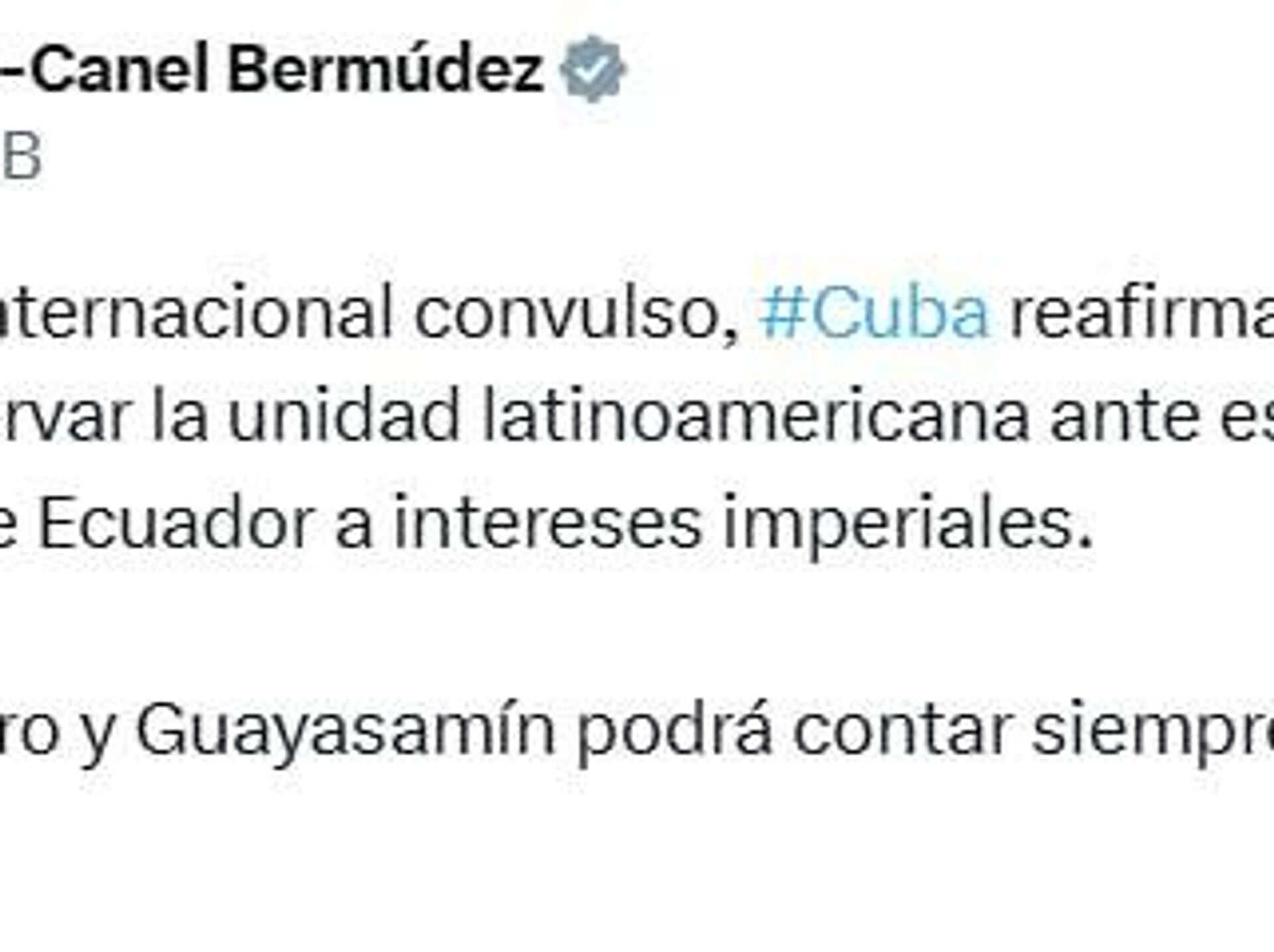 "En un contexto internacional convulso, Cuba reafirma su voluntad de abogar por preservar la unidad latinoamericana ante esta política de clara sumisión de Ecuador a intereses imperiales", escribió en su perfil de X.