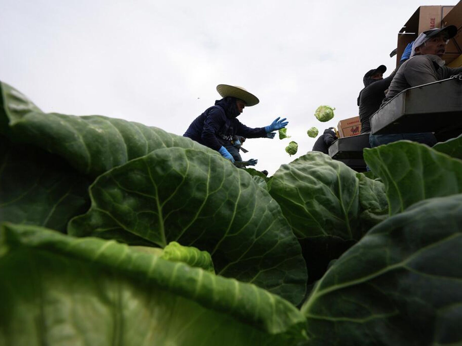 Trabajadores cosechan repollo el miércoles 5 de marzo de 2025 en un campo a menos de diez millas de la frontera con México, en Holtville, California. (Foto AP/Gregory Bull) - Sputnik Mundo, 1920, 13.03.2026