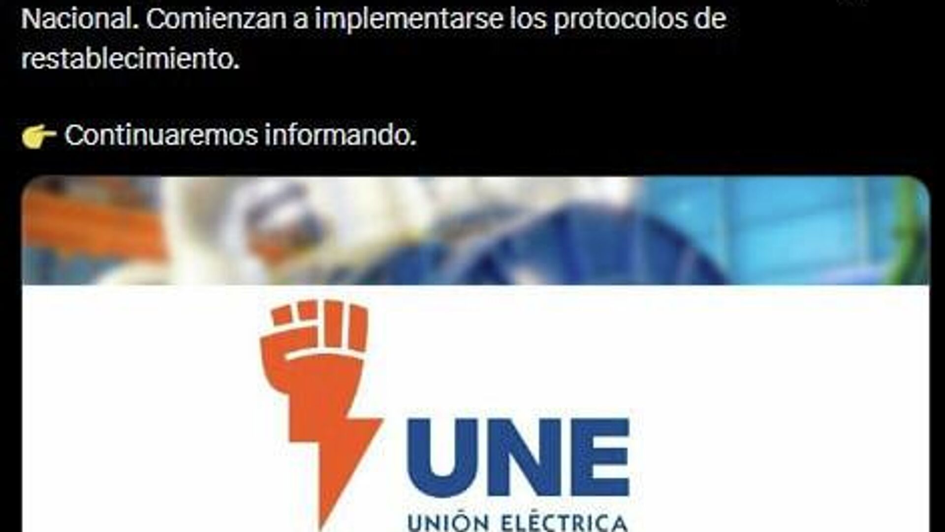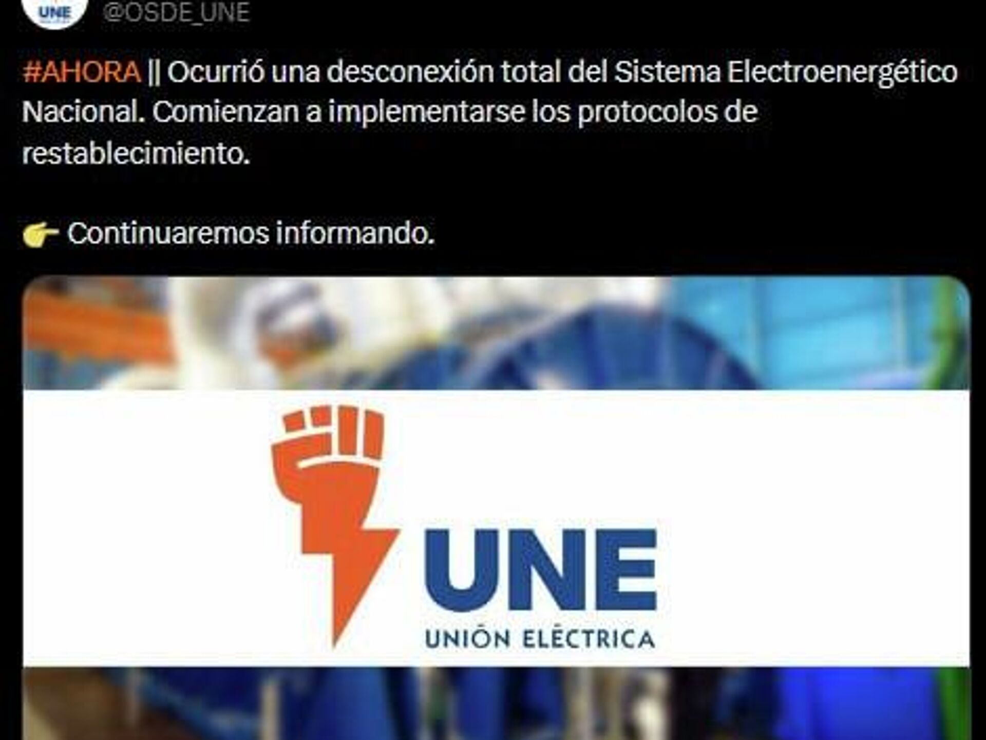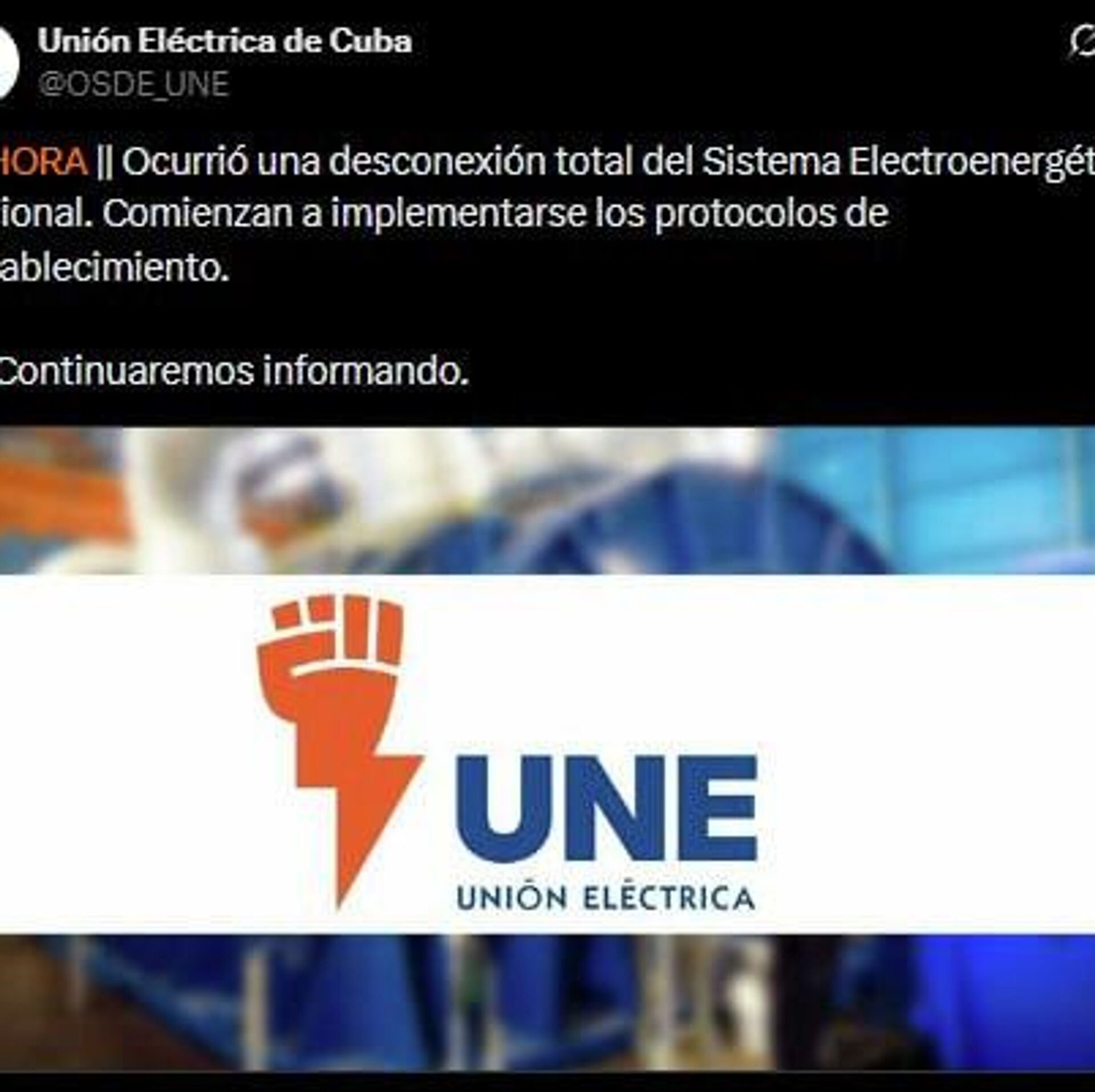 "Ocurrió una desconexión total del Sistema Electroenergético Nacional. Comienzan a implementarse los protocolos de restablecimiento", informa la Unión Eléctrica de Cuba en X.
