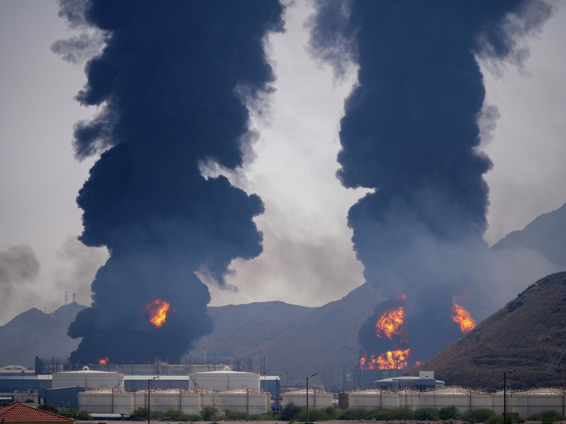 © AP Photo / Altaf QadriColumnas de humo y fuego se elevan después de que los restos de un dron iraní interceptado impactaran una instalación petrolera, según las autoridades, en Fuyaira, Emiratos Árabes Unidos