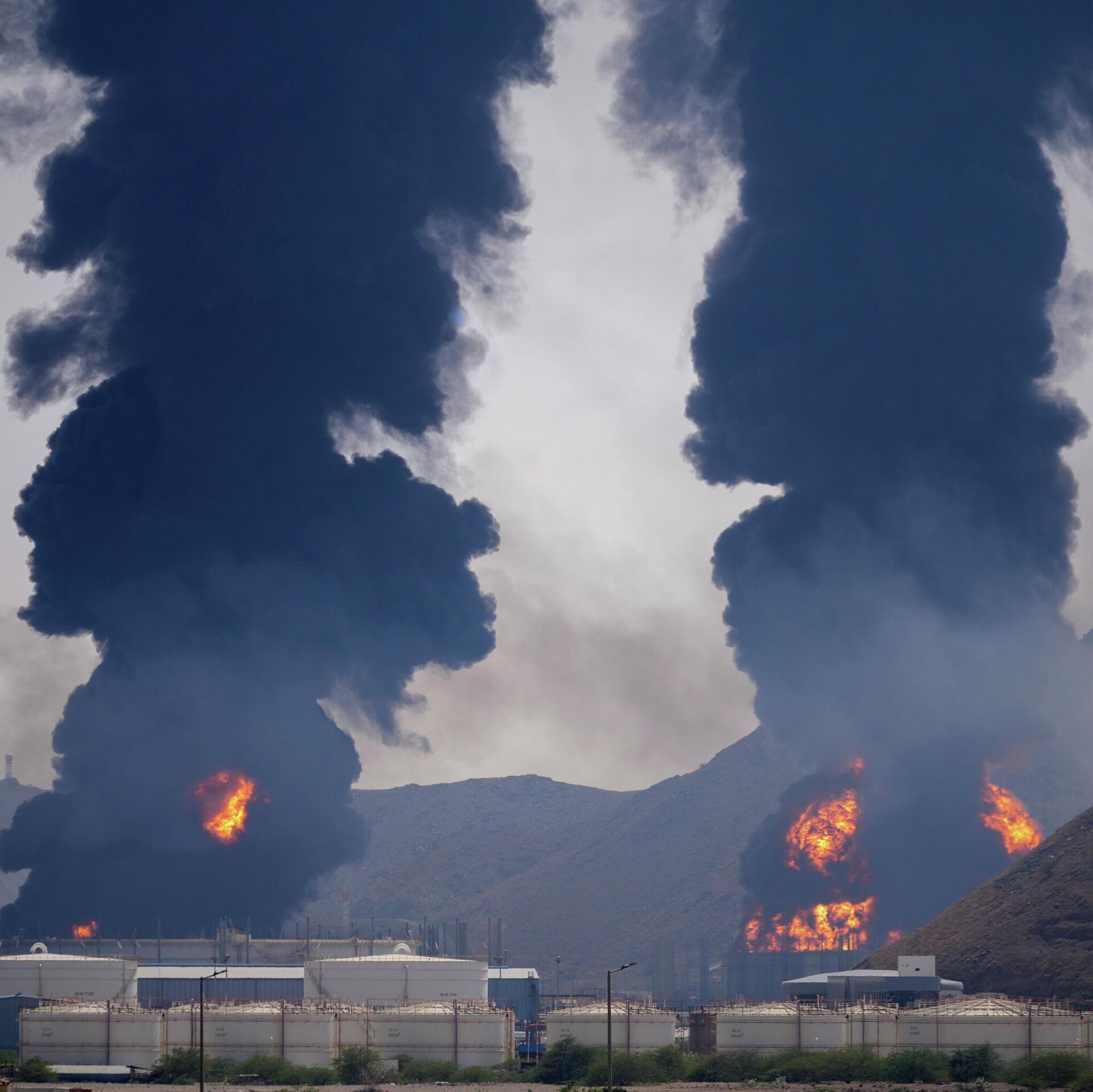 Columnas de humo y fuego se elevan después de que los restos de un dron iraní interceptado impactaran una instalación petrolera, según las autoridades, en Fuyaira, Emiratos Árabes Unidos - Sputnik Mundo, 1920, 07.04.2026