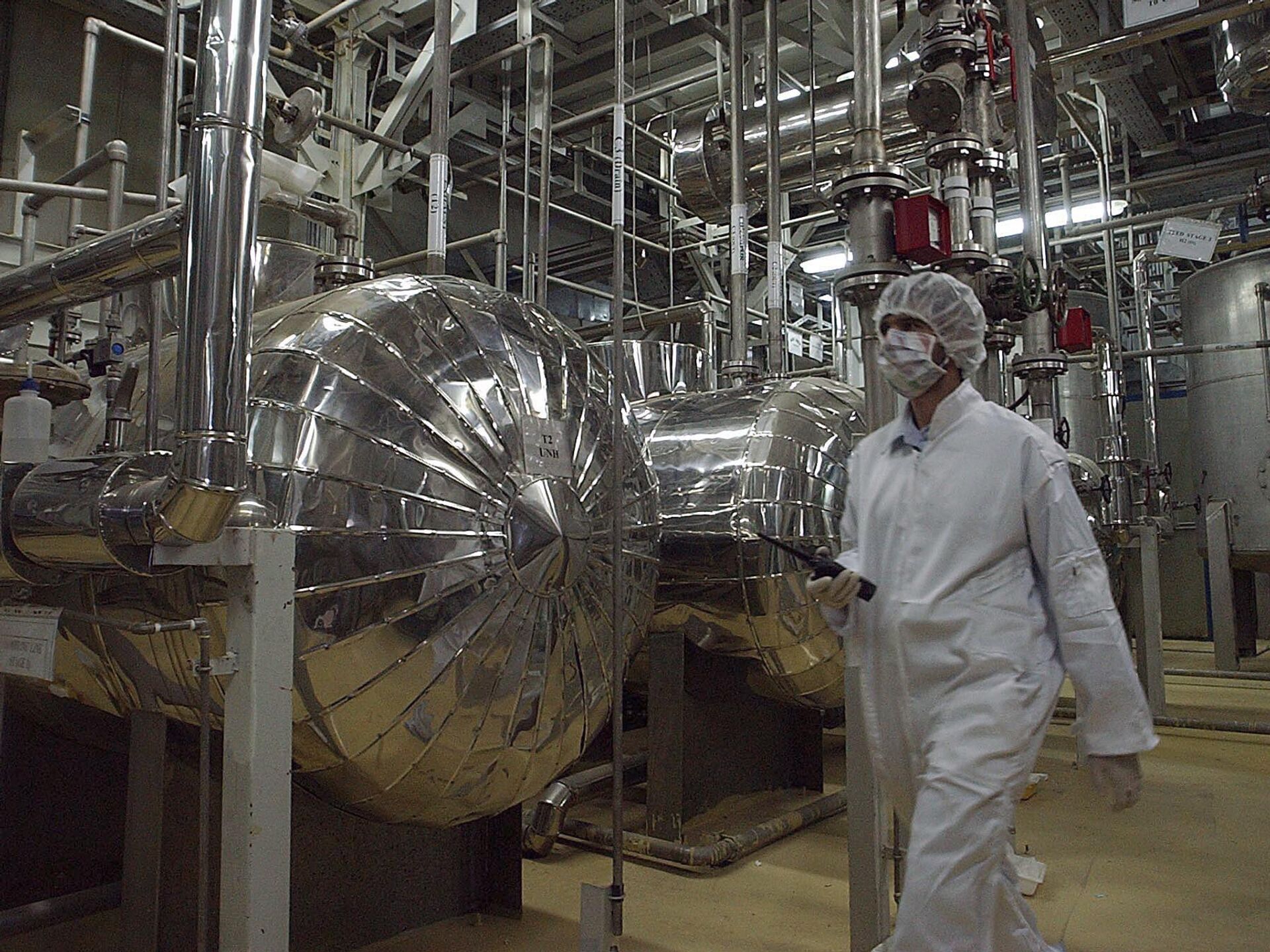 Un agente de seguridad iraní con ropa protectora recorre parte de las instalaciones de conversión de uranio a las afueras de la ciudad iraní de Isfahán, 30 de marzo de 2005 - Sputnik Mundo, 1920, 20.04.2026