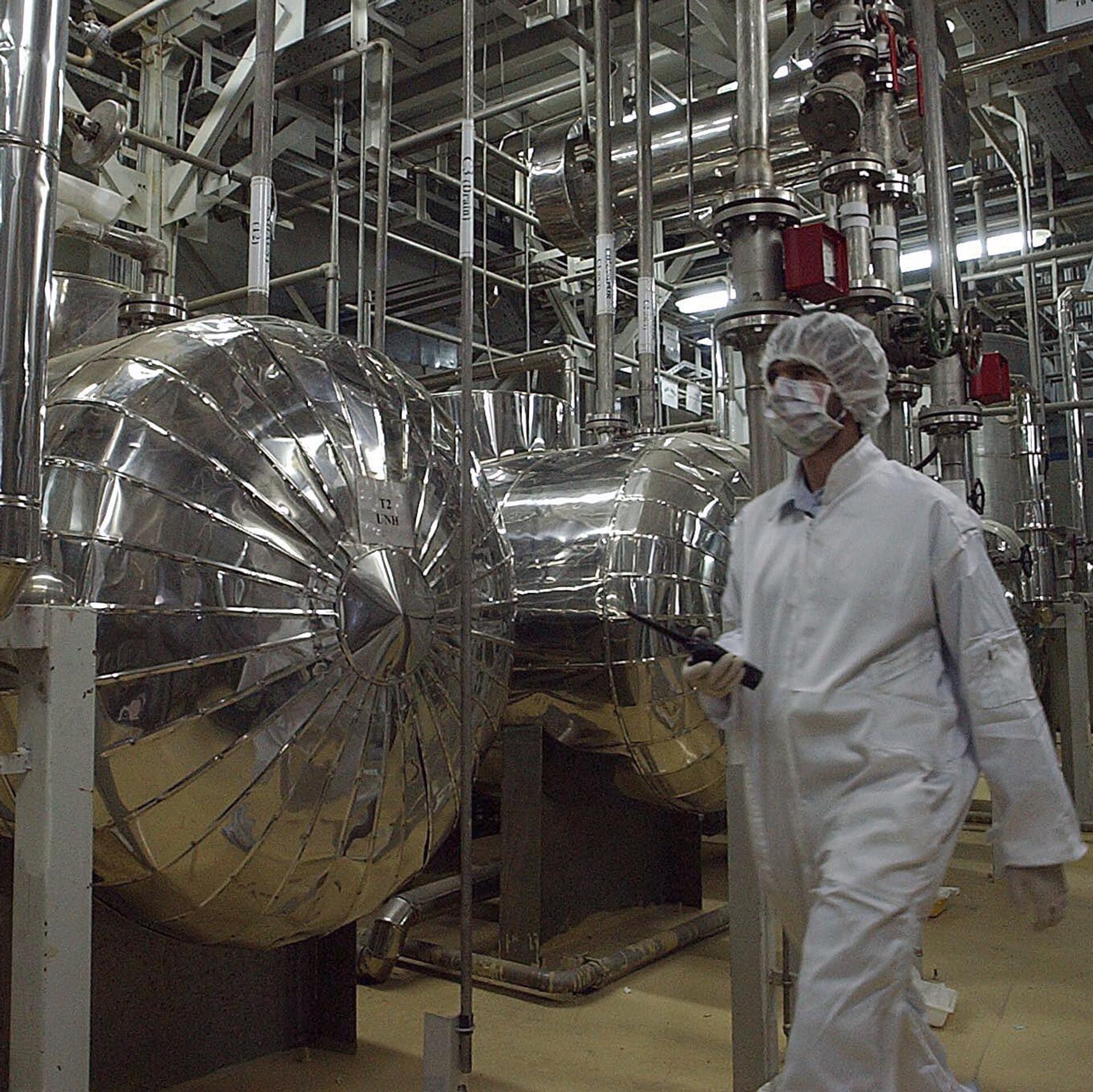 © AP Photo / Vahid SalemiUn agente de seguridad iraní con ropa protectora recorre parte de las instalaciones de conversión de uranio a las afueras de la ciudad iraní de Isfahán, 30 de marzo de 2005